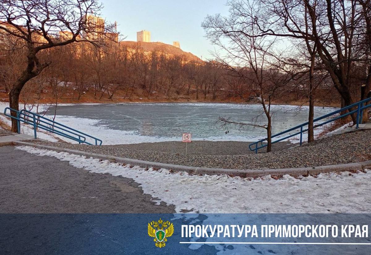 Во Владивостоке проводится доследственная проверка по факту халатности должностных лиц, ответственных за безопасность общественной территории в парке Минного городка. Следователи и прокуратура подключились после того, несовершеннолетняя провалилась в одно из озёр. Ребёнок остался жив, и сейчас на месте уже установили таблички о запрете выхода на лёд.