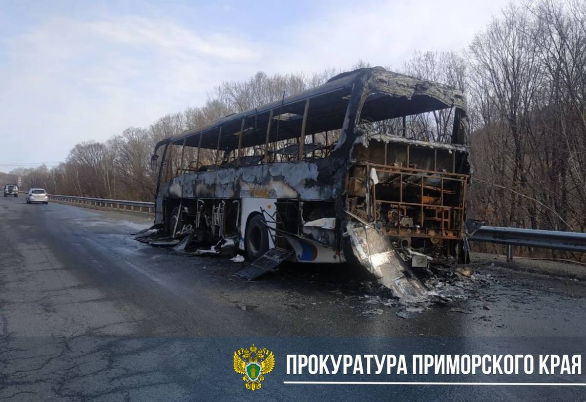 Прокуратура организовала проверку по факту возгорания автобуса и в отношении компании перевозчика, зарегистрированного в Спасске-Дальнем. Надзорное ведомство даст оценку полноте мер, принимаемых к техническому обслуживанию транспортного средства, качеству услуг по перевозке пассажиров и багажа, а также их соответствию требованиям закона.