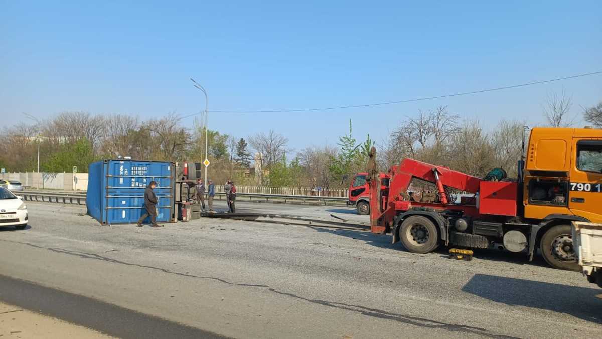 На улице Маковского в районе Океанской опрокинулся контейнеровоз. Большегруз смял несколько метров лееров и остался лежать на левой полосе.