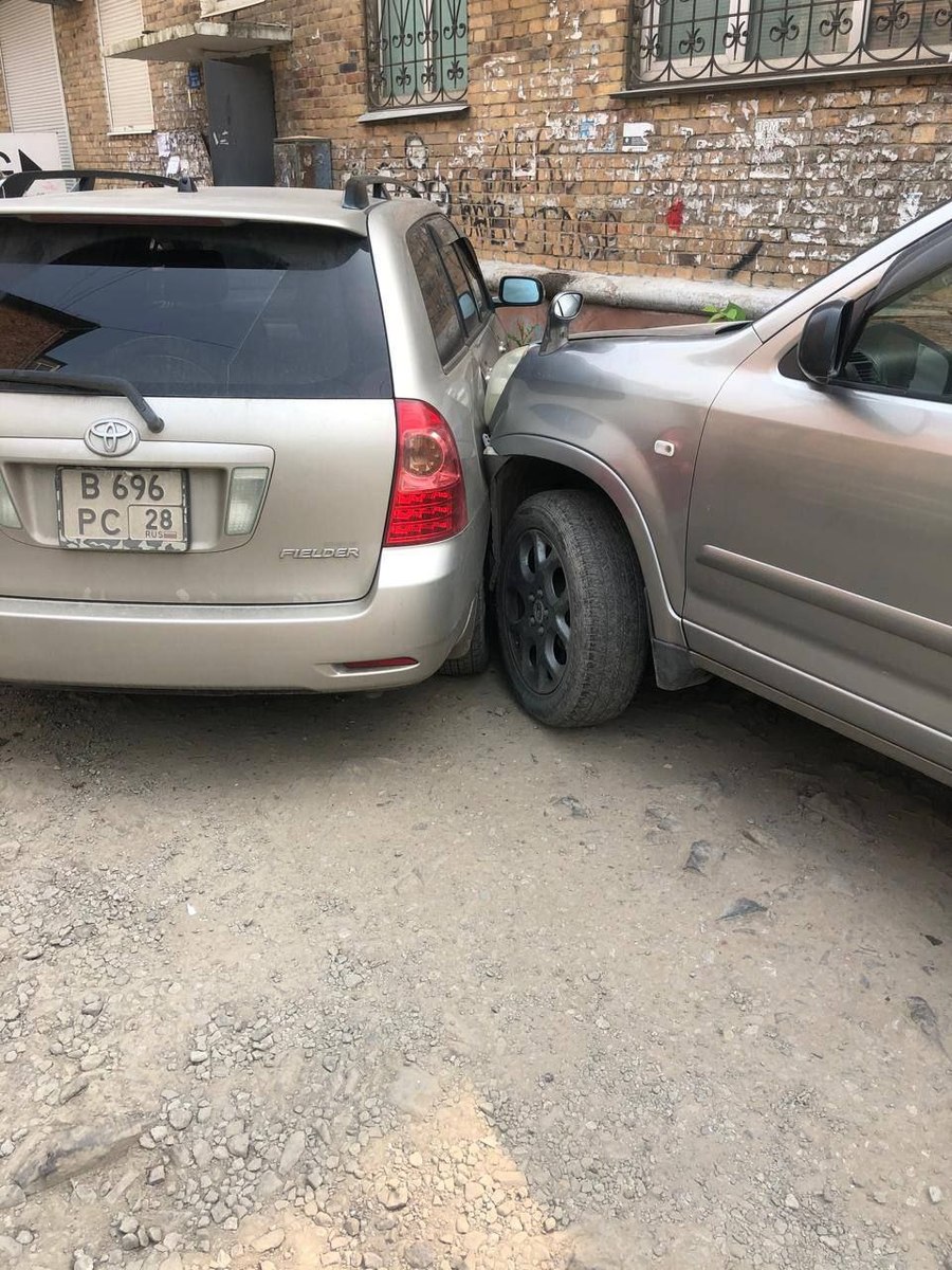 На самом же деле машин было больше, и произошло всё так: местные жители поняли, что в их дворе находится водитель в неадекватном состоянии, стали снимать его на видео. Мужчина в ответ показал им средний палец, резко сдал назад и врезался в Honda Fit. Потом как будто попытался уехать, но задом ударил Premio. Когда ему наконец удалось развернуться, он дал газу и, подпрыгнув всеми четырьмя колёсами на яме, умчался в соседний двор, где подбил Fielder и HR-V, а затем отлетел в Prius и Juke, между которыми в итоге застрял.