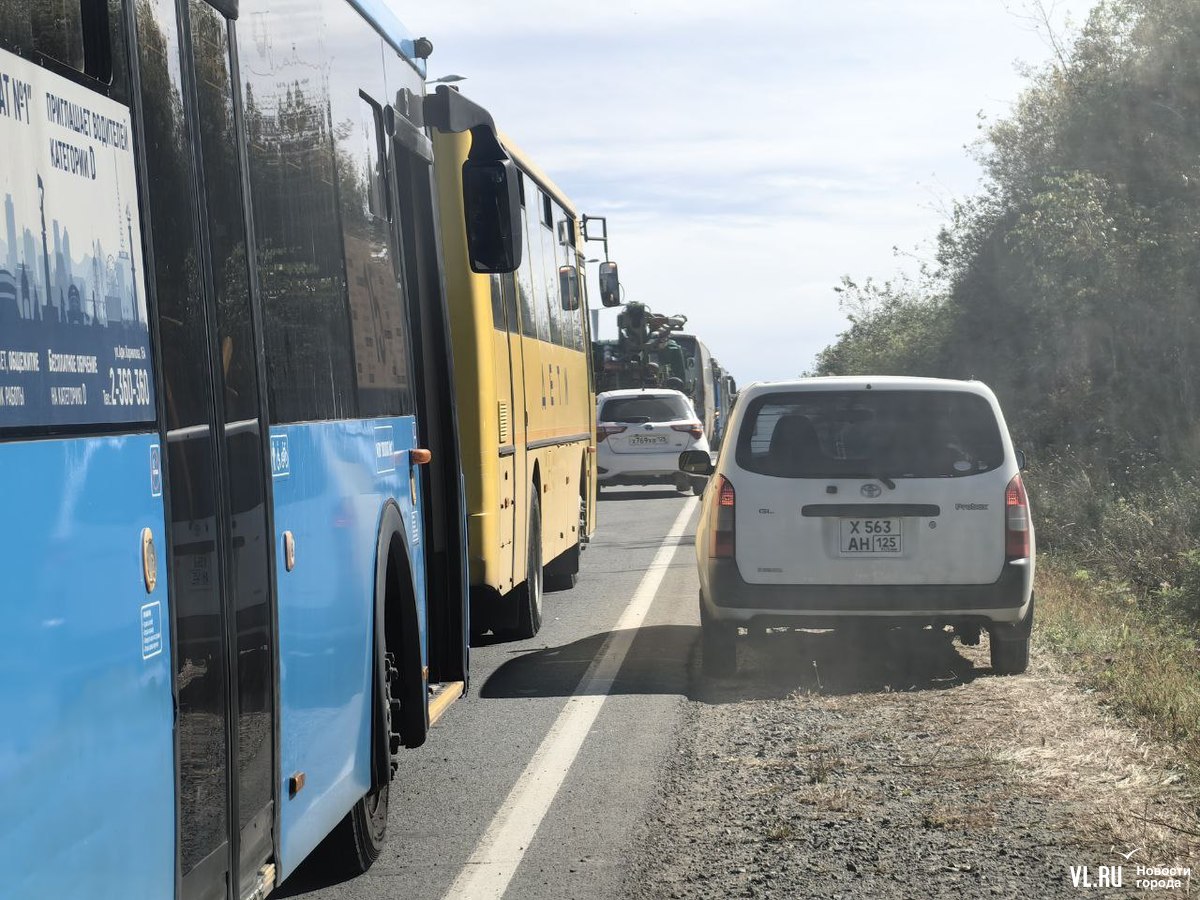Его можно объехать по обочине справа и даже, судя по фото, слева. Но поскольку в очереди много других самосвалов и автобусов, люди в потоке не видят возможности объезда и стоят.