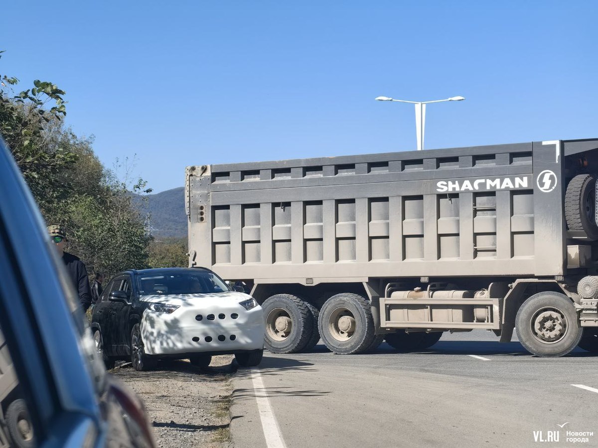По словам очевидцев, самосвал разворачивался из правого ряда и задел легковушку. В итоге он остановился поперёк дороги и занял обе полосы.