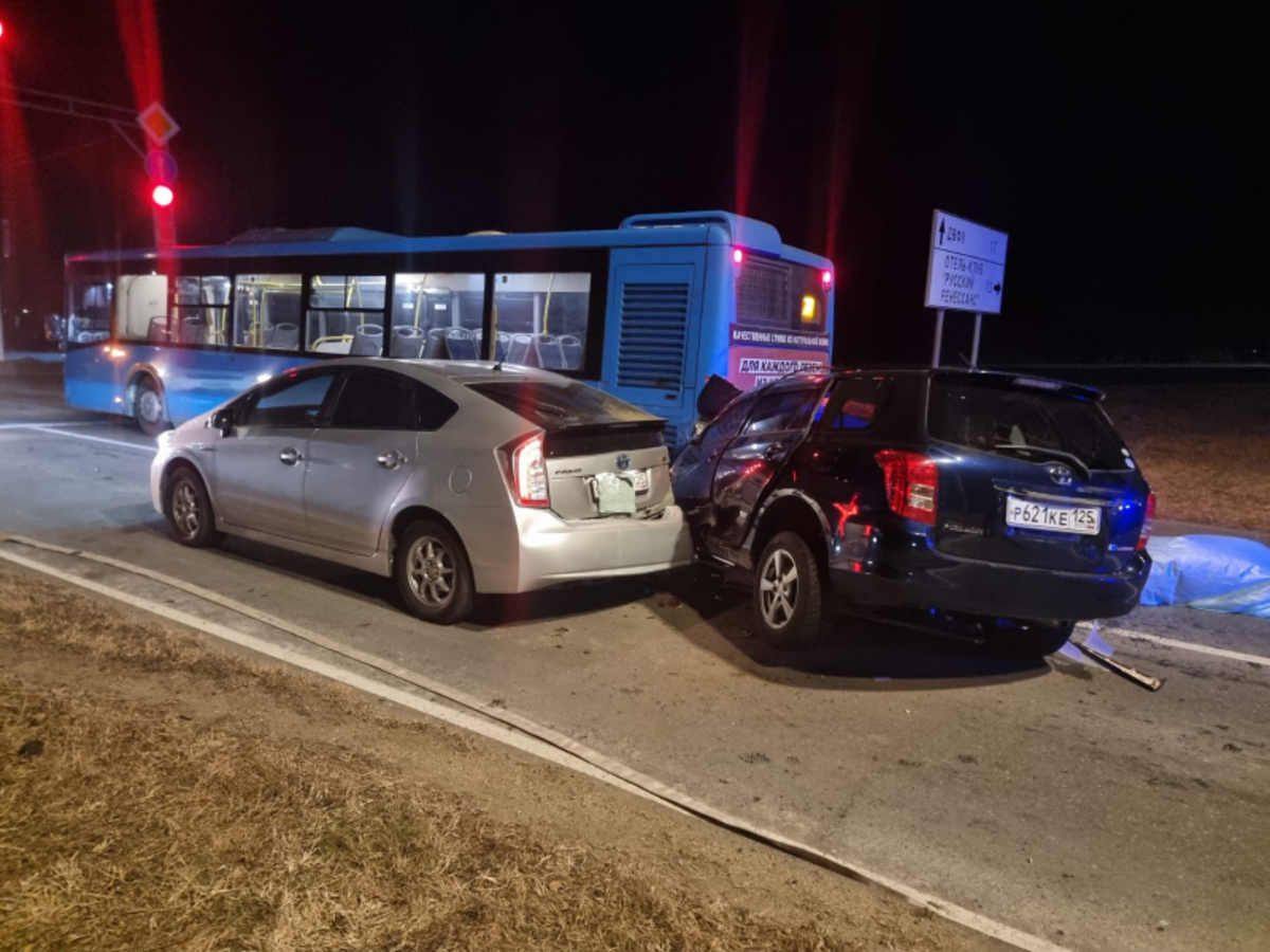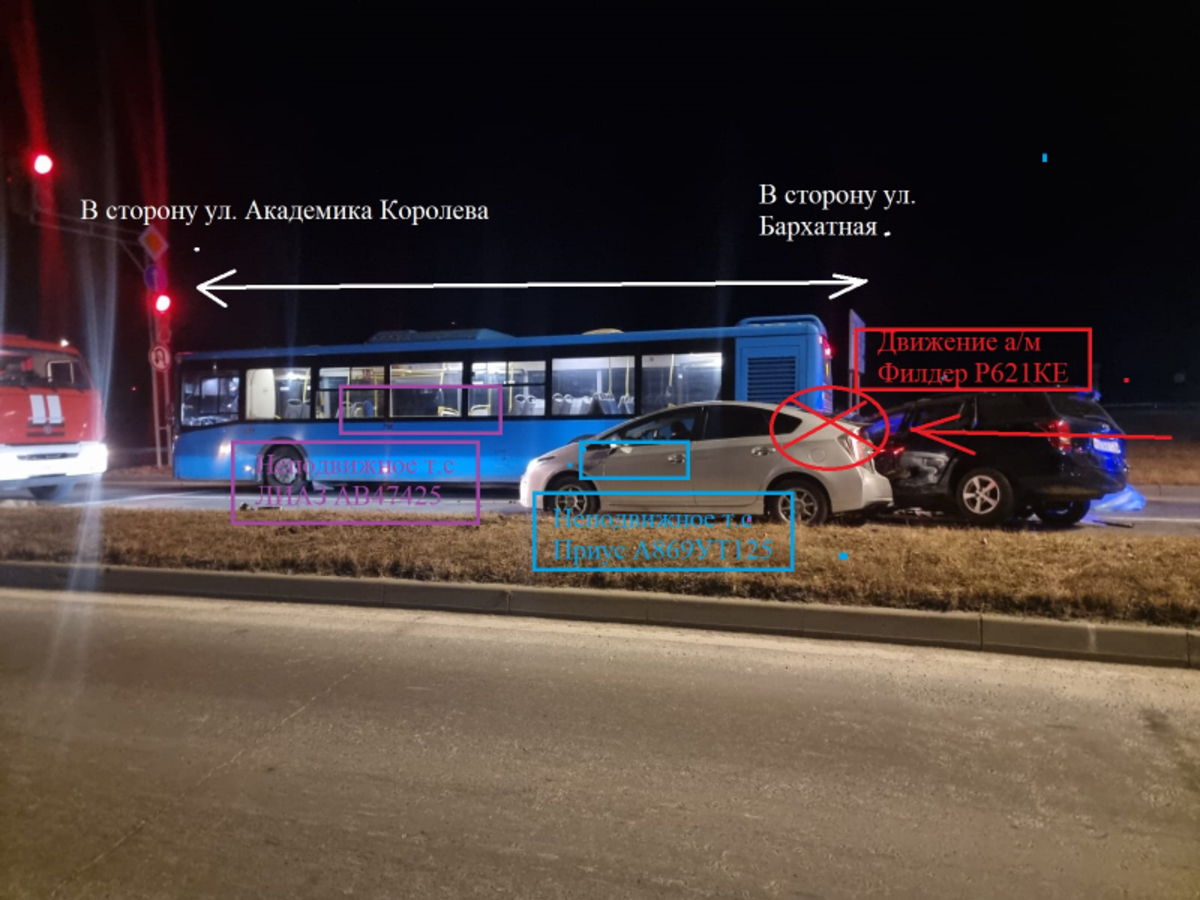 Обновление 10:37: По информации Госавтоинспекции, 46-летний водитель Toyota Corolla Fielder врезался в Toyota Prius и автобус ЛиАЗ, которые остановились на запрещающий сигнал светофора. Автобус следовал по маршруту № 77 (парк Победы – океанариум) с пассажирами.