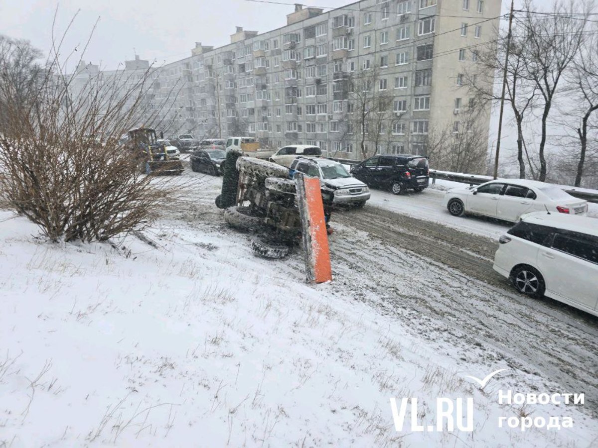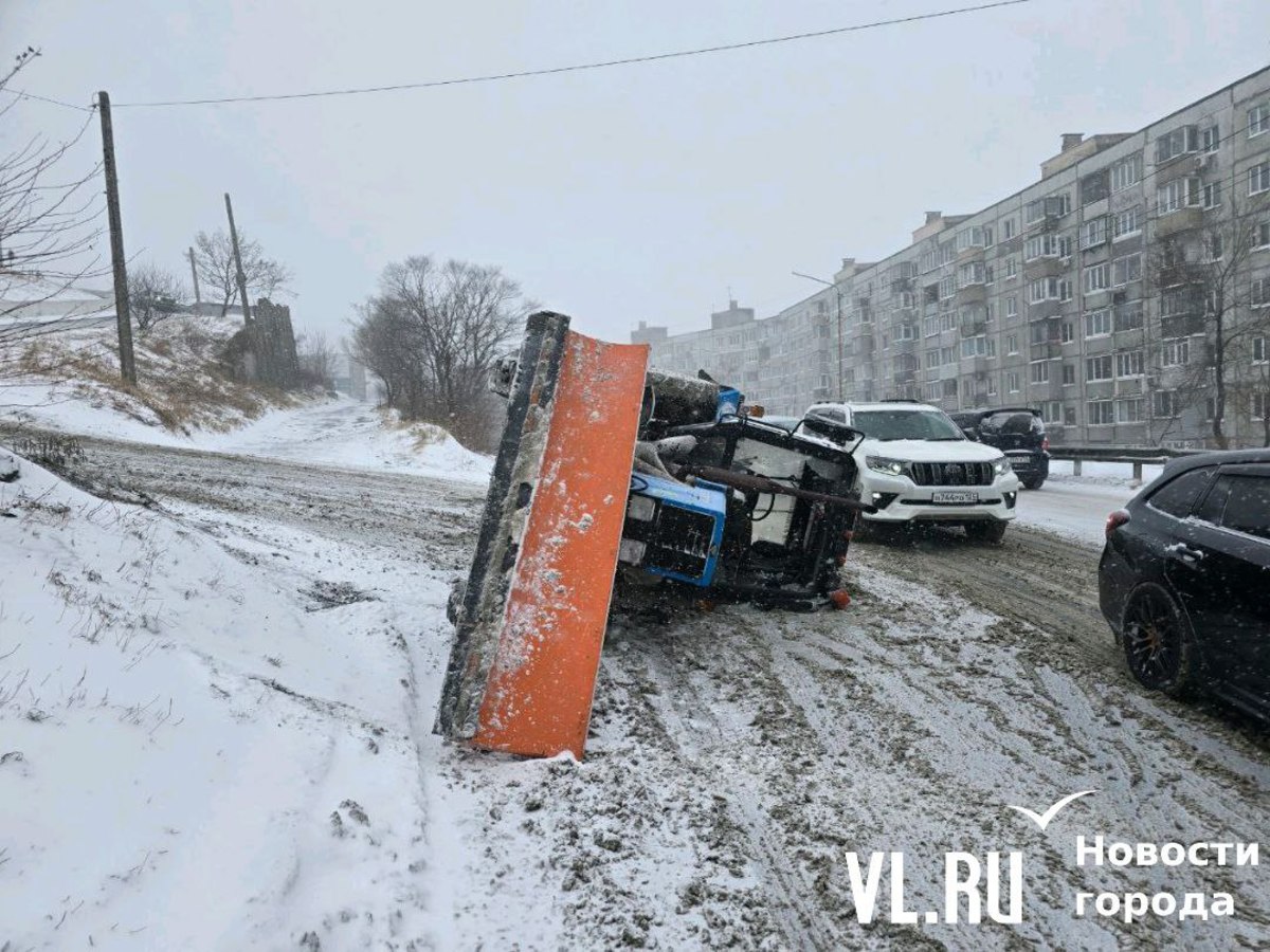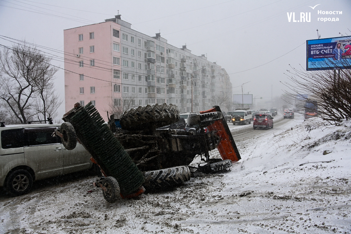 Во время метели во вторник, 28 января, во Владивостоке произошло две аварии со снегоуборочной техникой. Одна случилась на Котельникова – трактор завалился на бок, вторая – на низководном мосту, где в пескоразбрасывающую машину по очереди въехали две легковушки.