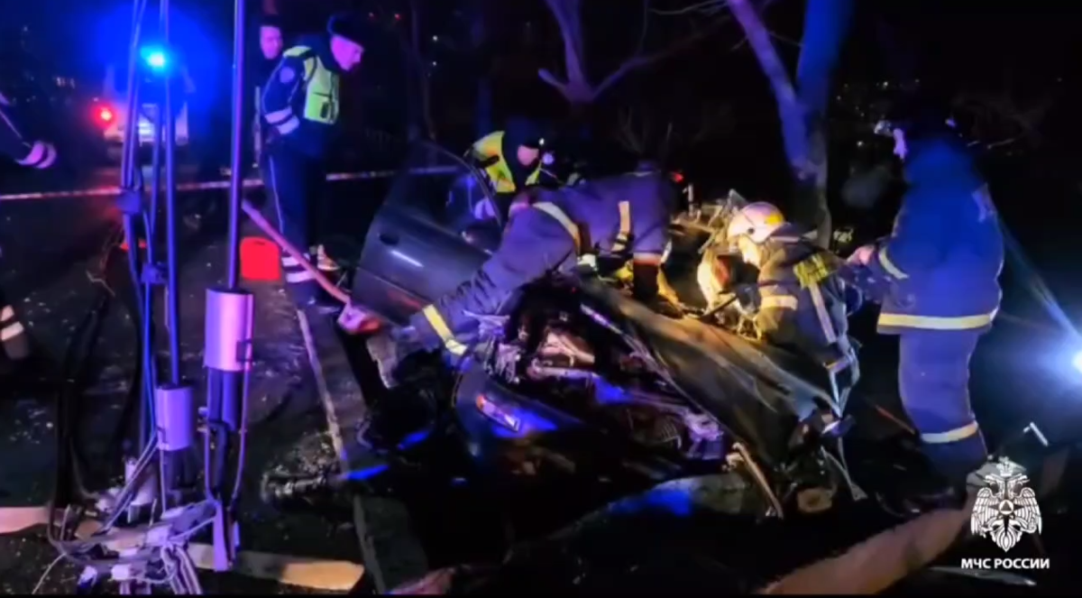 На видео, опубликованном МЧС, видно, что автомобиль очень сильно пострадал в аварии, все его части сильно смяты.