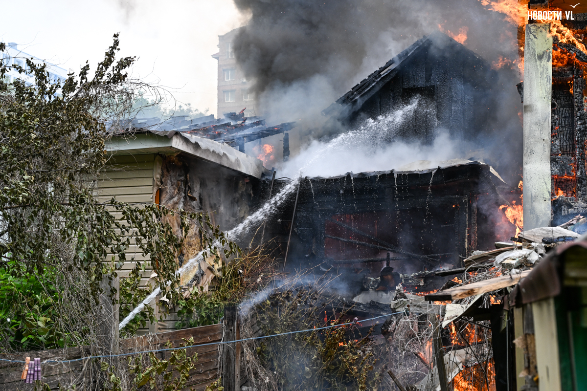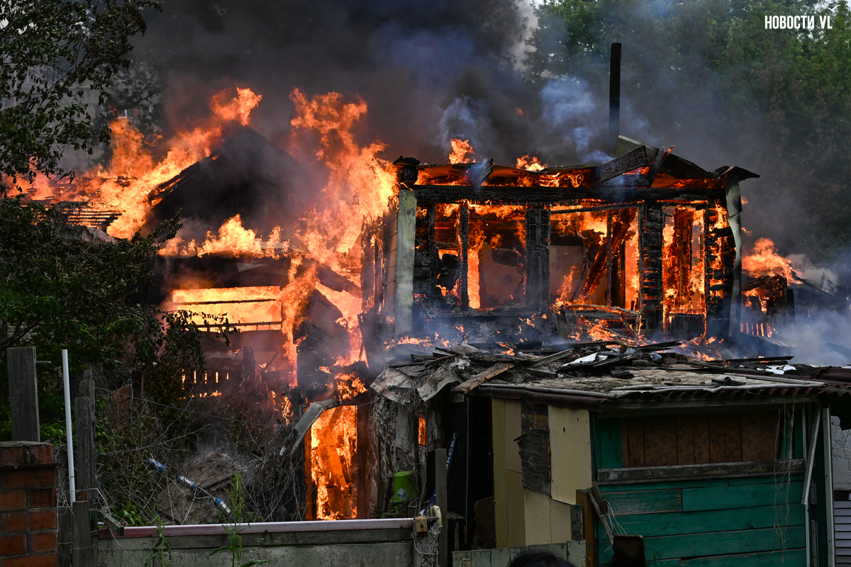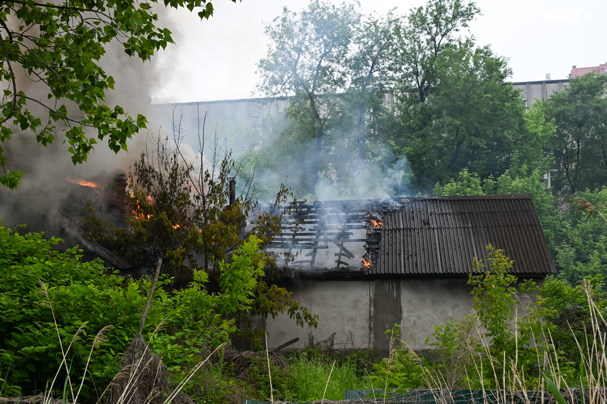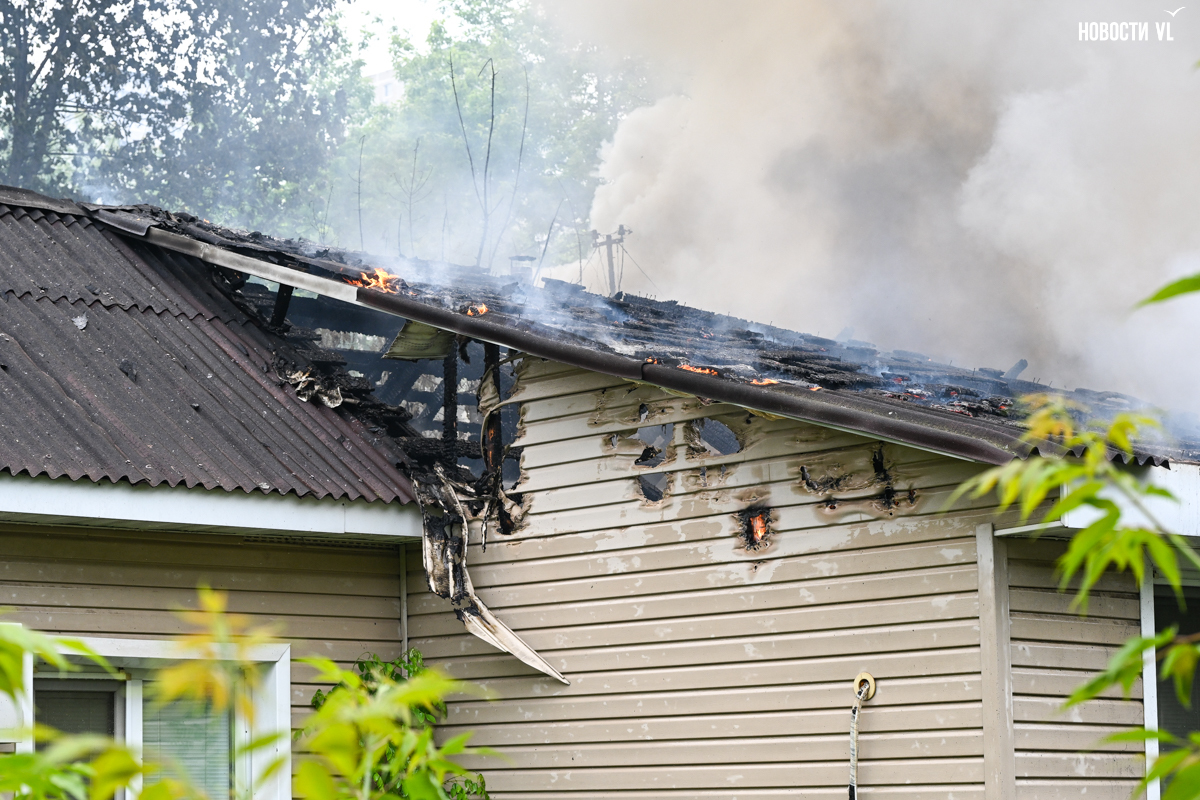 Корреспондент Новостей VL.ru сообщает, что горит дом, который горел уже несколько раз. Огонь перекинулся на крышу соседнего жилого дома.