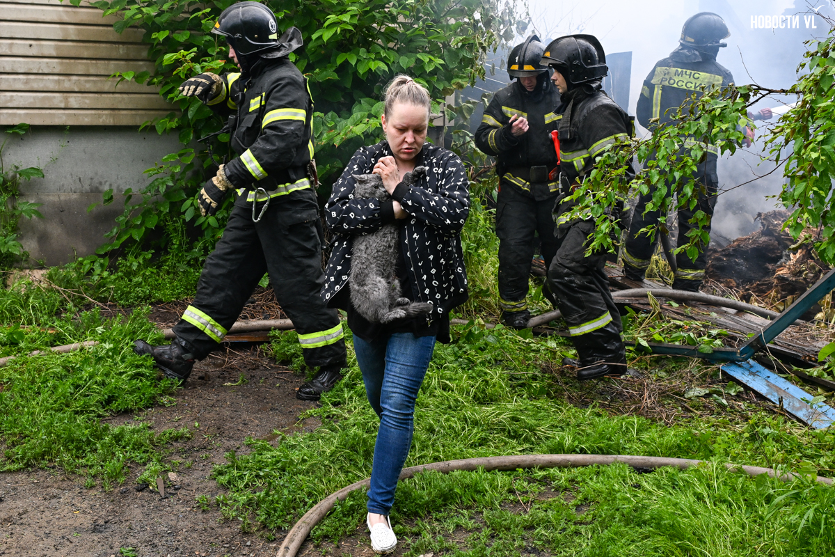 Обновление 10:11: Из пожара спасли серую кошку Тиму. Она была в жилом доме, пожарные долго искали её в дыму, но, когда её наконец удалось найти, она вырвалась из рук пожарных и побежала в сторону горевшего дома. Кошку ловили двое пожарных и хозяйка. В конце концов её поймали и передали владелице.