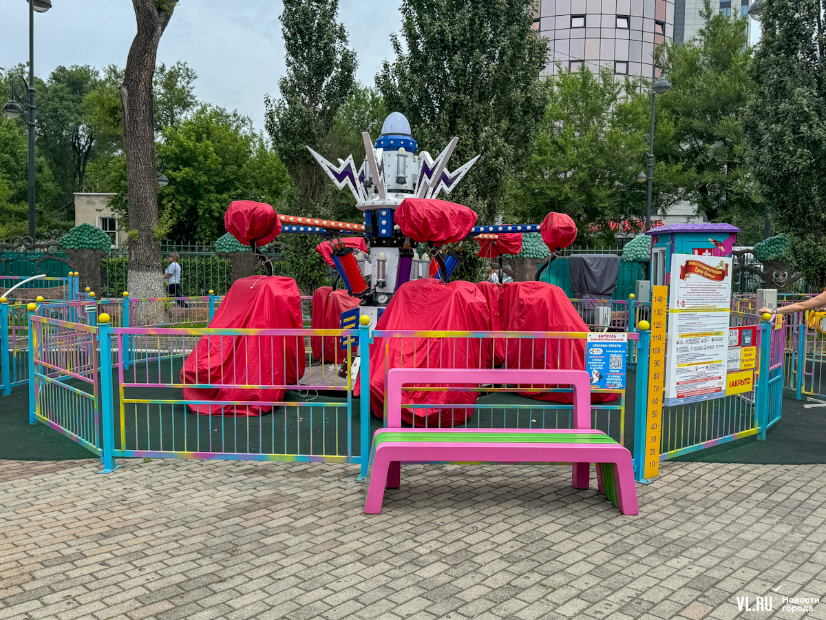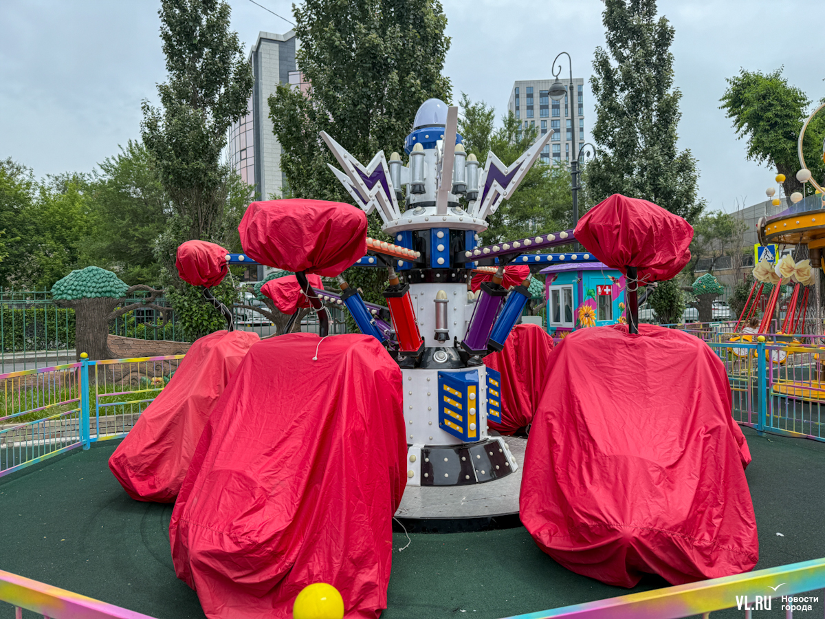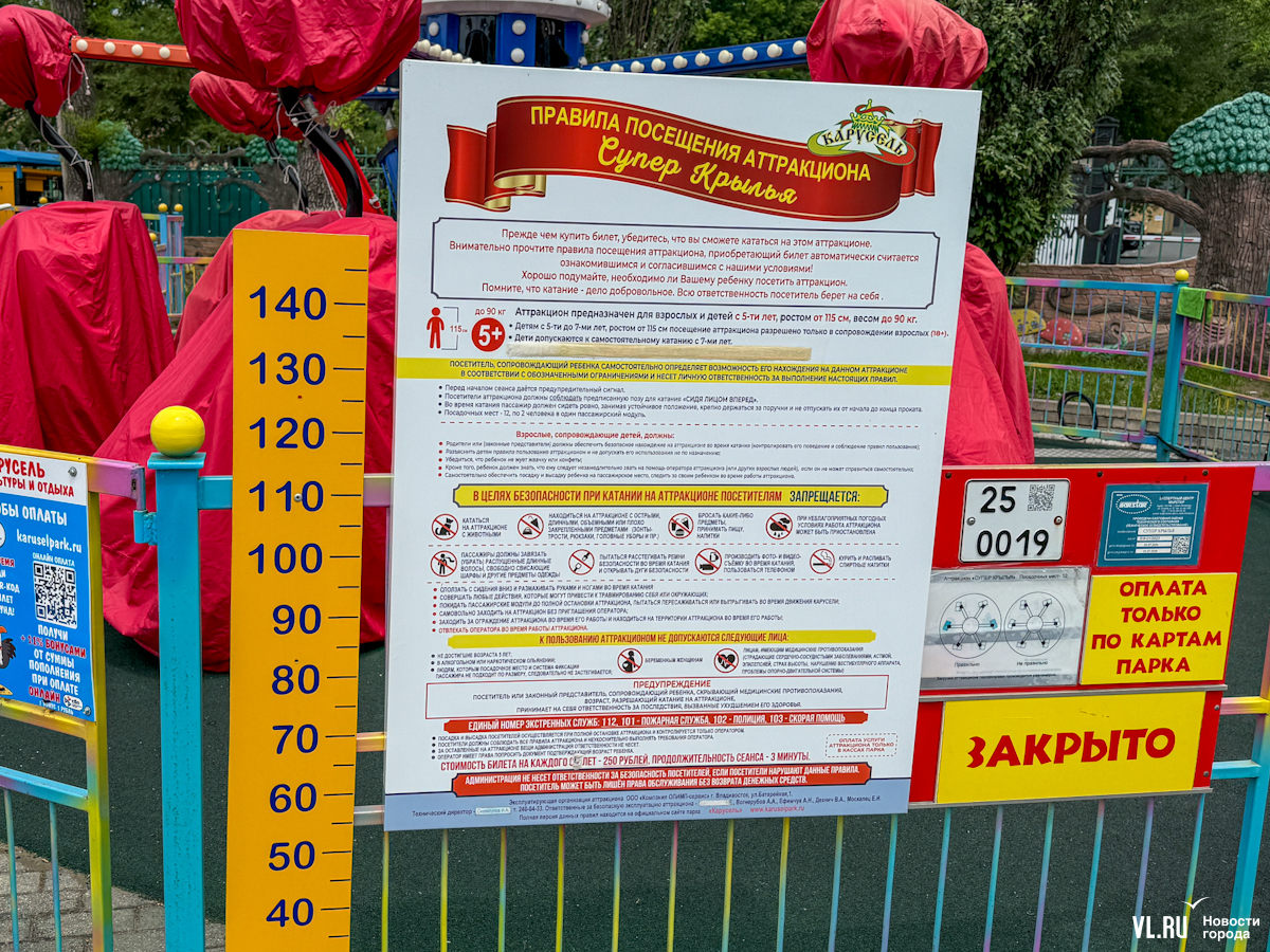 15:08: Аттракцион «Супер Крылья» в парке «Карусель» сейчас закрыт, кресла спрятаны под чехлами. На табличке рядом с ним говорится, что билет стоит 250 рублей. Аттракцион рассчитан на детей и взрослых (от 5 лет, от 115 сантиметров, до 90 килограммов). Рядом с каруселью стоит ростомер, а весов корреспондент Новостей VL.ru не обнаружил.