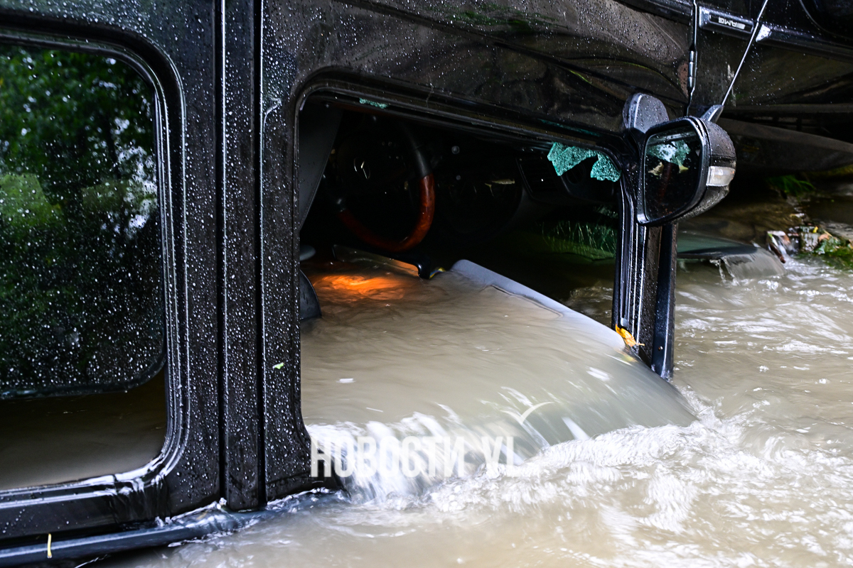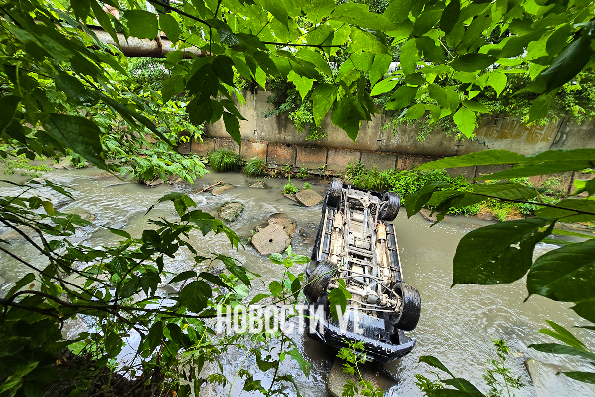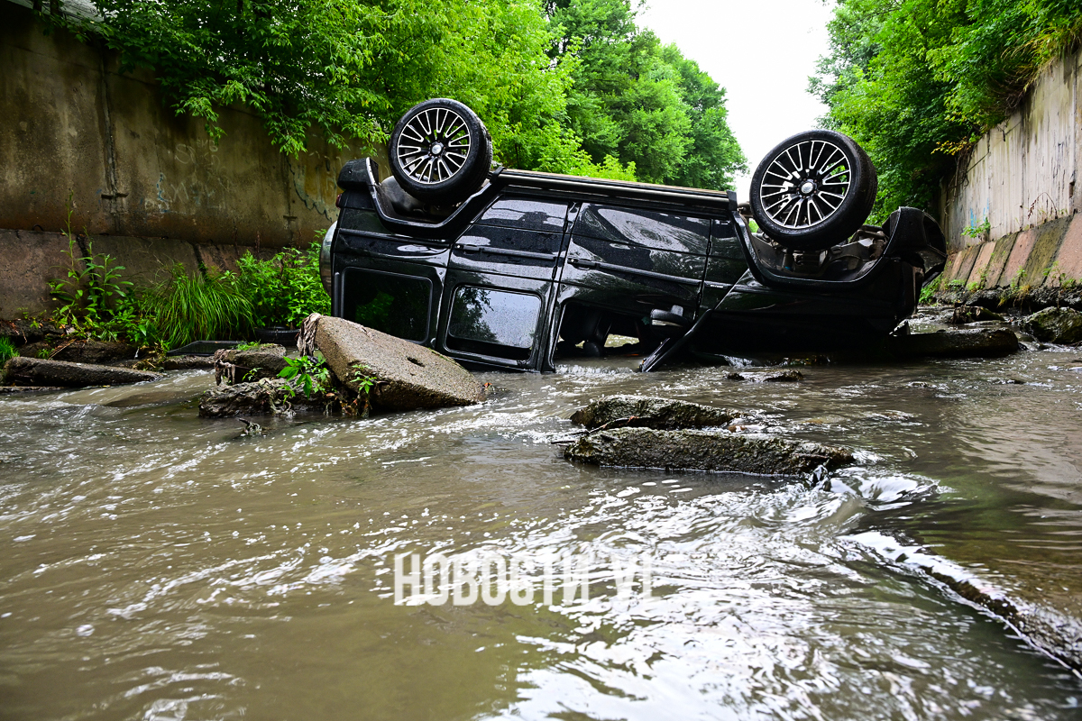На Бородинской, когда водитель попытался тронуться, автомобиль скатился в мелкое русло и перевернулся на крышу. Сан вылетел из него и потерял сознание, а когда его начало захлёстывать водой, очнулся и вылез наверх. Он практически не пострадал, если не считать нескольких царапин на коленях, чего не скажешь о машине. У «Гелендвагена» выбило несколько стёкол и смяло корпус. Также повредился бензобак, из-за чего топливо вытекает в речку.