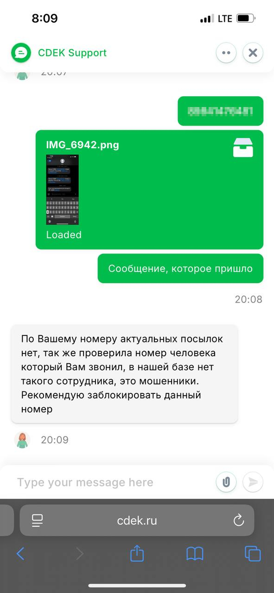 Медлить не стала, но успела списаться только с двумя близкими – снова стали звонить через WhatsApp. Лучший выход – связаться с поддержкой компании напрямую. В чат со специалистом отправили номер телефона звонящего и скриншот сообщения, которое, кстати, пришло от СДЭК – в истории сохранились предыдущие сообщения. Для проверки наличия посылок необходимо назвать только свой номер телефона.