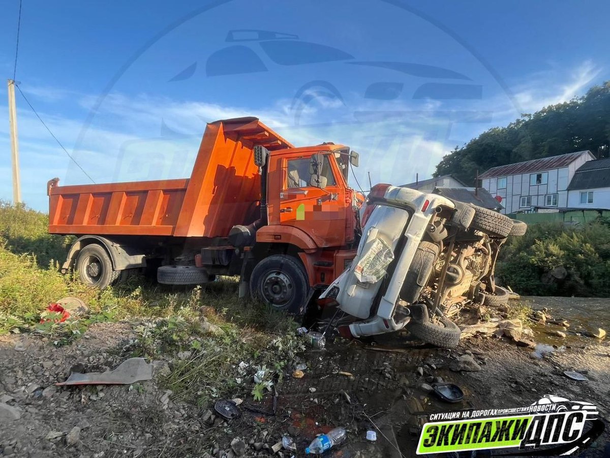 Самосвал с пустым кузовом скатился с дороги и протаранил припаркованную Mitsubishi Delica. После столкновения оба автомобиля оказались в речке. Крышу автомобиля вдавило внутрь, а кузов сплющило так, что теперь в этой груде металла микроавтобус не узнать.