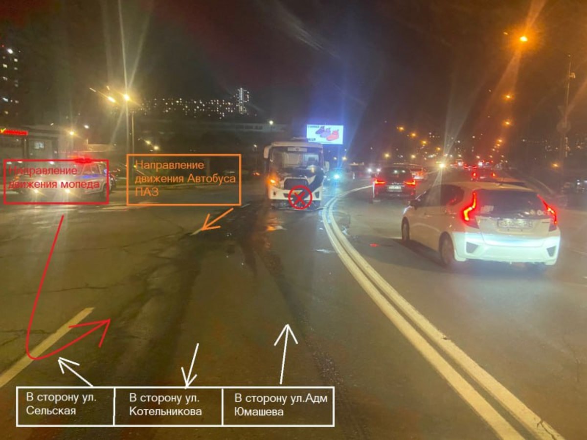Автобус двигался в сторону центра и уже проехал развязку, когда перед ним оказался мопед. Двухколёсное транспортное средство в итоге оказалось под автобусом. Управлявший им мужчина получил травмы, на место вызвали скорую и полицию.