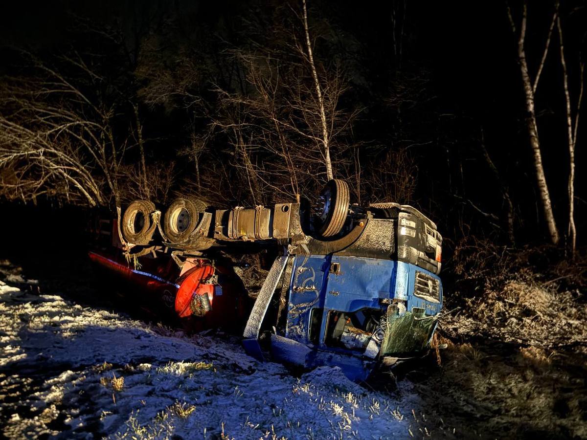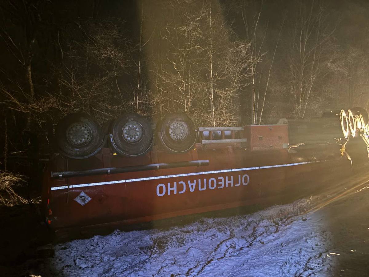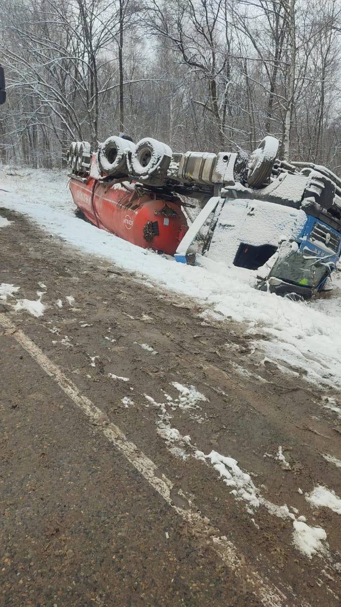 Во время снегопада в понедельник, 10 ноября, в Чугуевском округе большегруз перевернулся и оказался в кювете. Утечки топлива из цистерны не произошло.