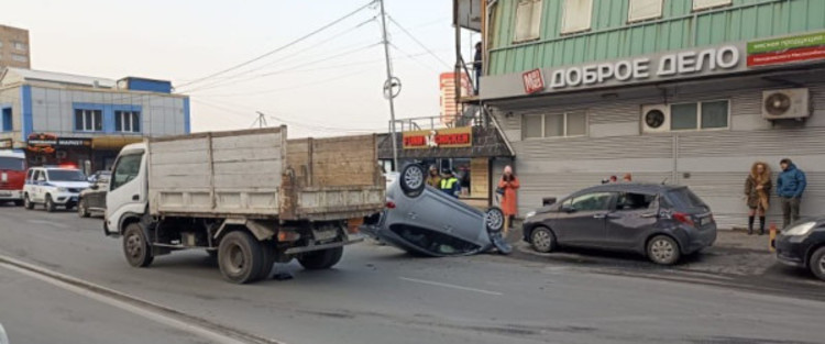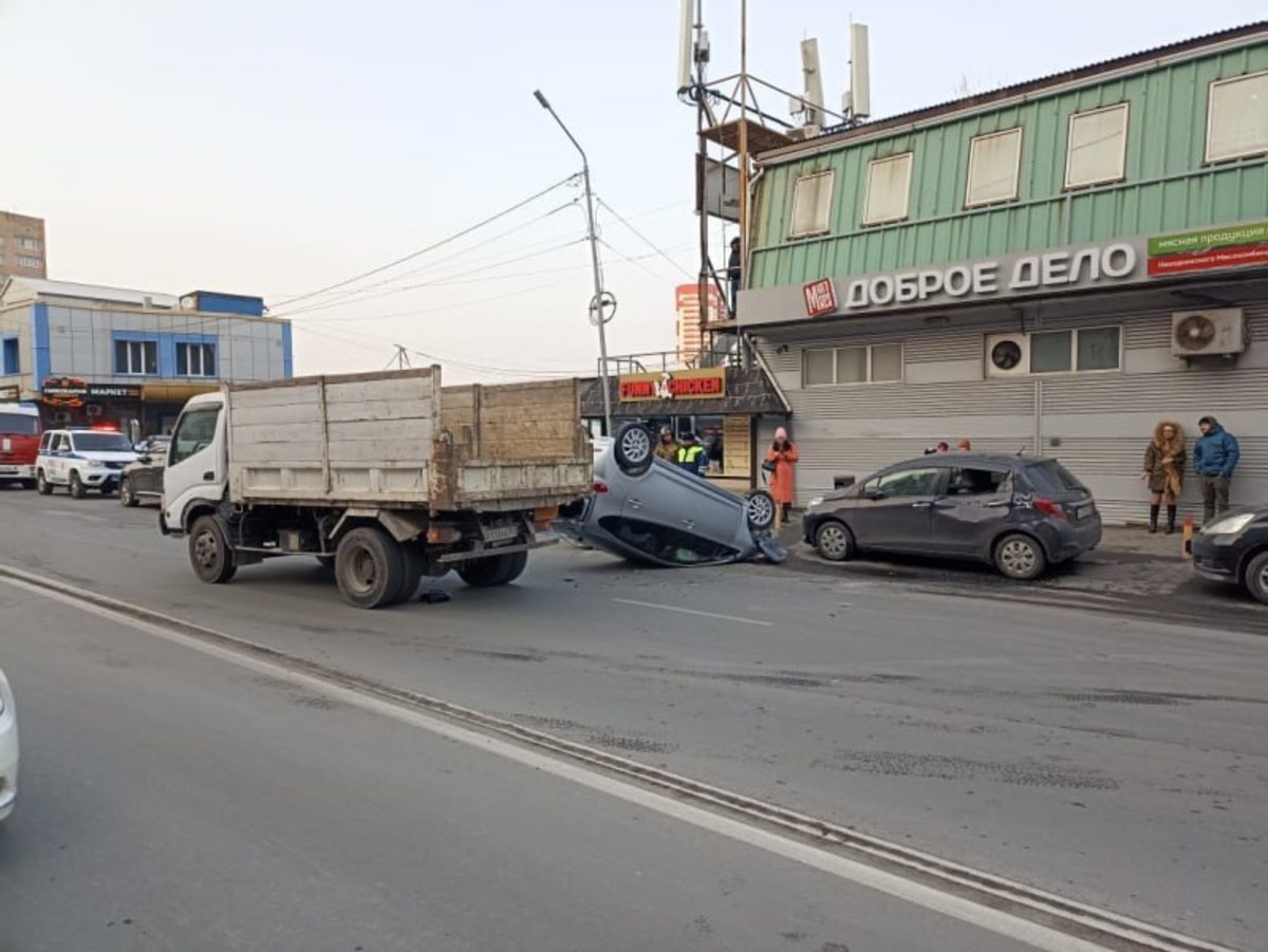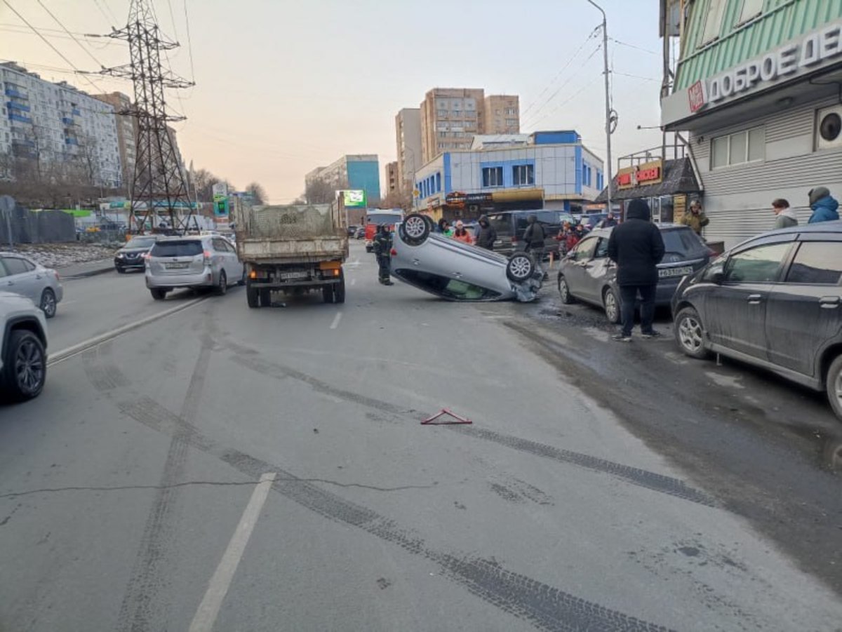 Daihatsu Sonica столкнулась с Toyota Dyna в районе кольца Третьей Рабочей во Владивостоке. От удара кей-кар перевернулся и задел припаркованную Toyota Vitz. В аварии пострадала пассажир Daihatsu Sonica.