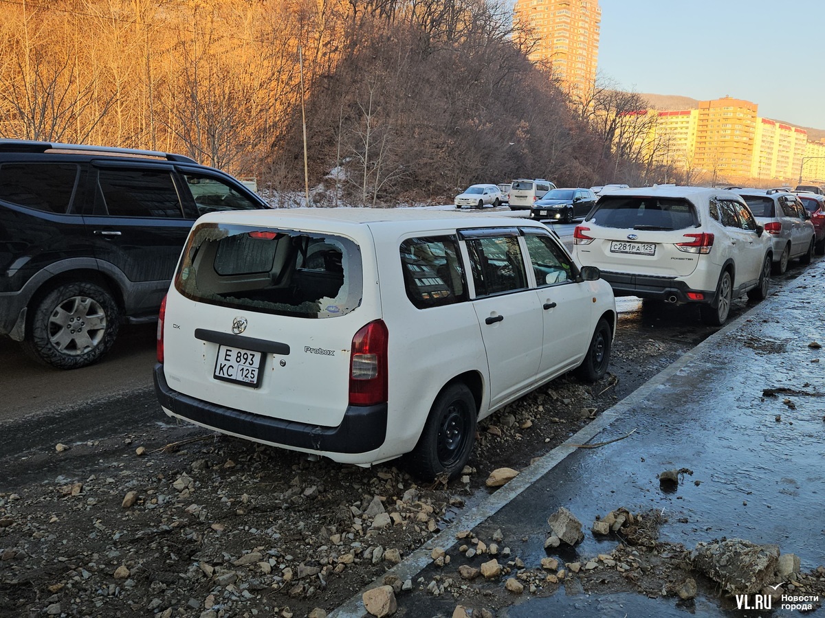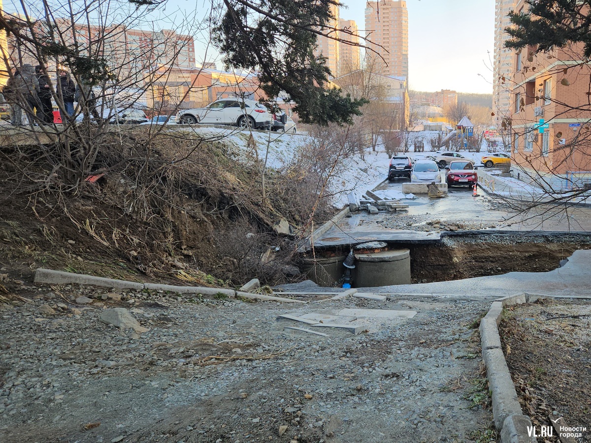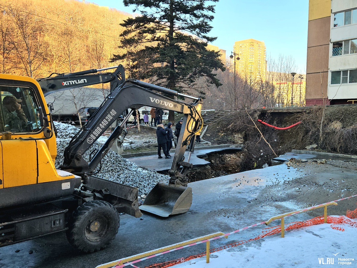17:17: На данный момент фонтан уже не бьёт – сейчас из трубы в траншее слабо вытекает вода. В основном залило придомовую территорию, на основную дорогу вода почти не попала. Дворы засыпаны камнями. Пострадало 3 машины – заднее стекло у стоявшего вдоль дороги Toyota Probox разбито, Toyota Prado и Toyota Porte засыпаны камнями. На месте работают две бригады (восемь человек) и три единицы техники Примводоканала – ориентировочно, прорыв устранят до 06:00. Организован подвоз воды.