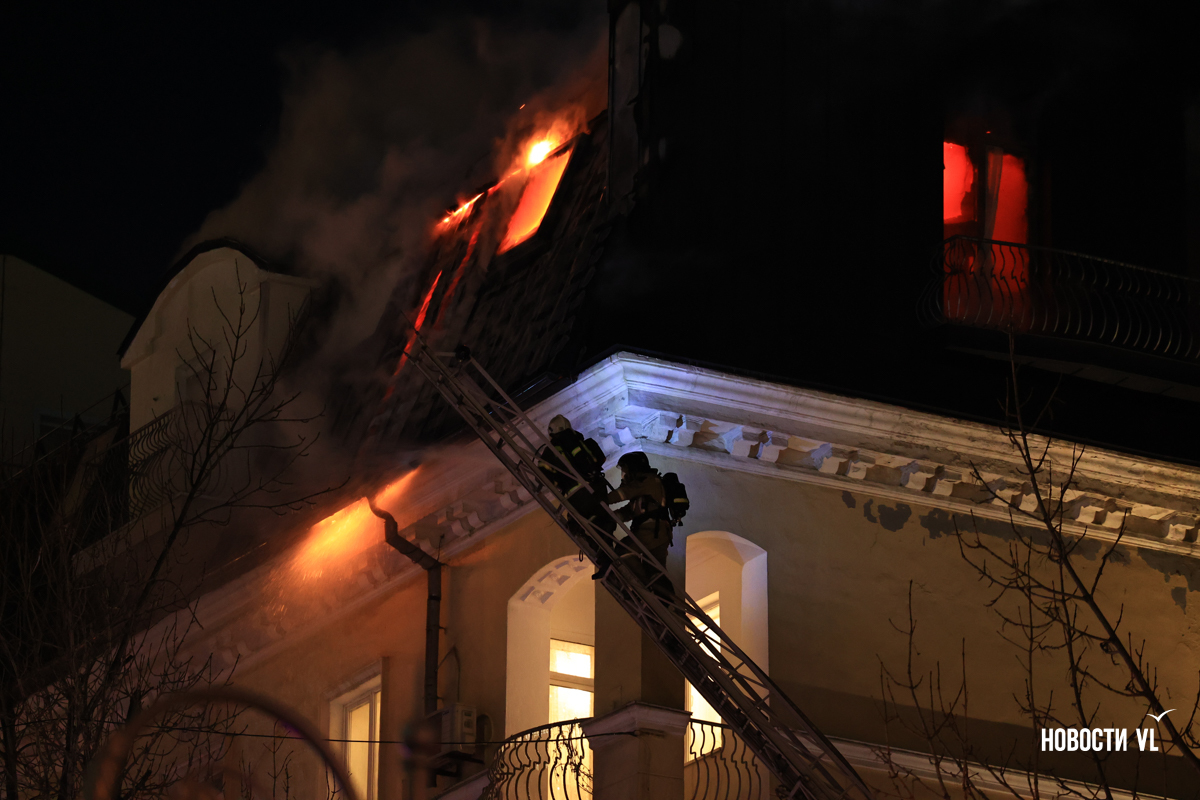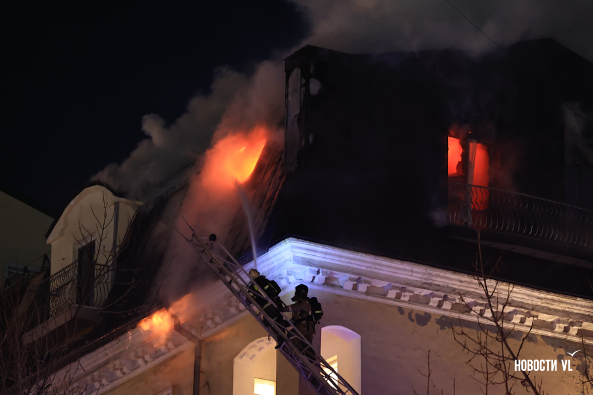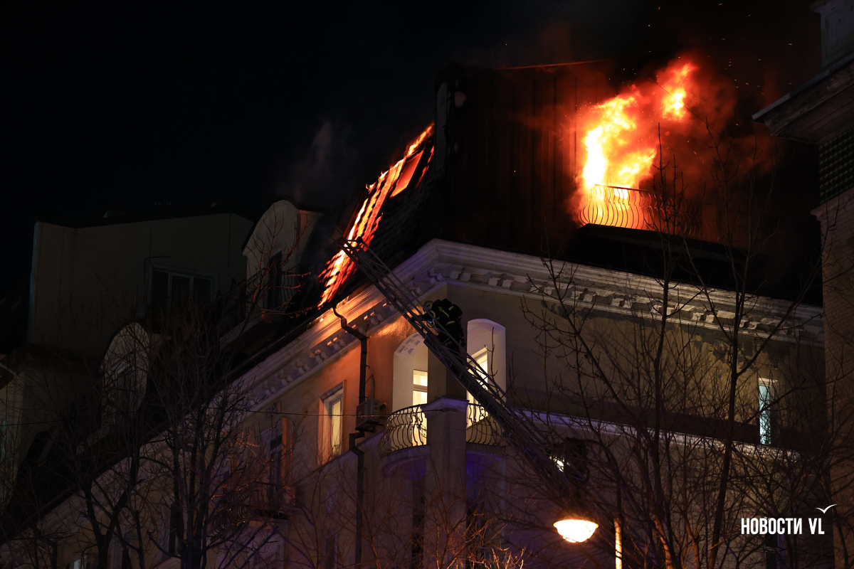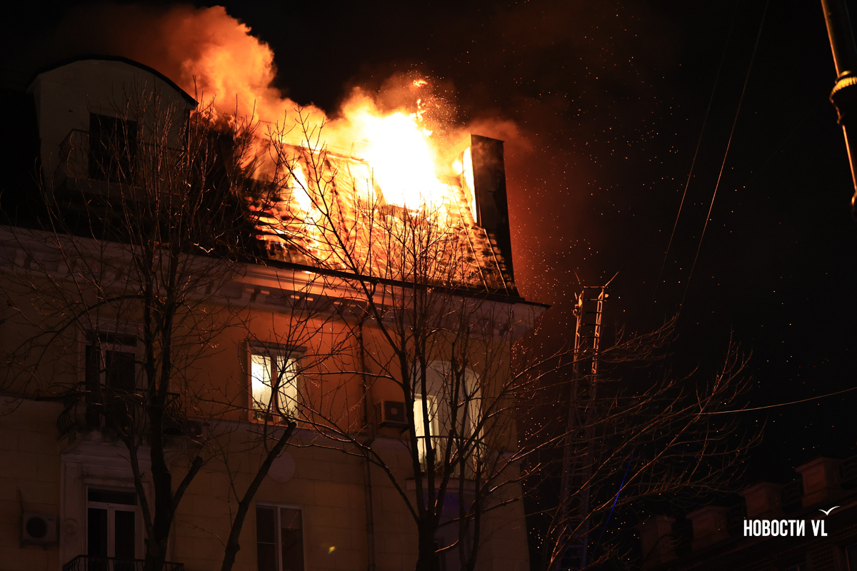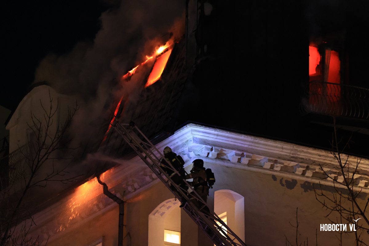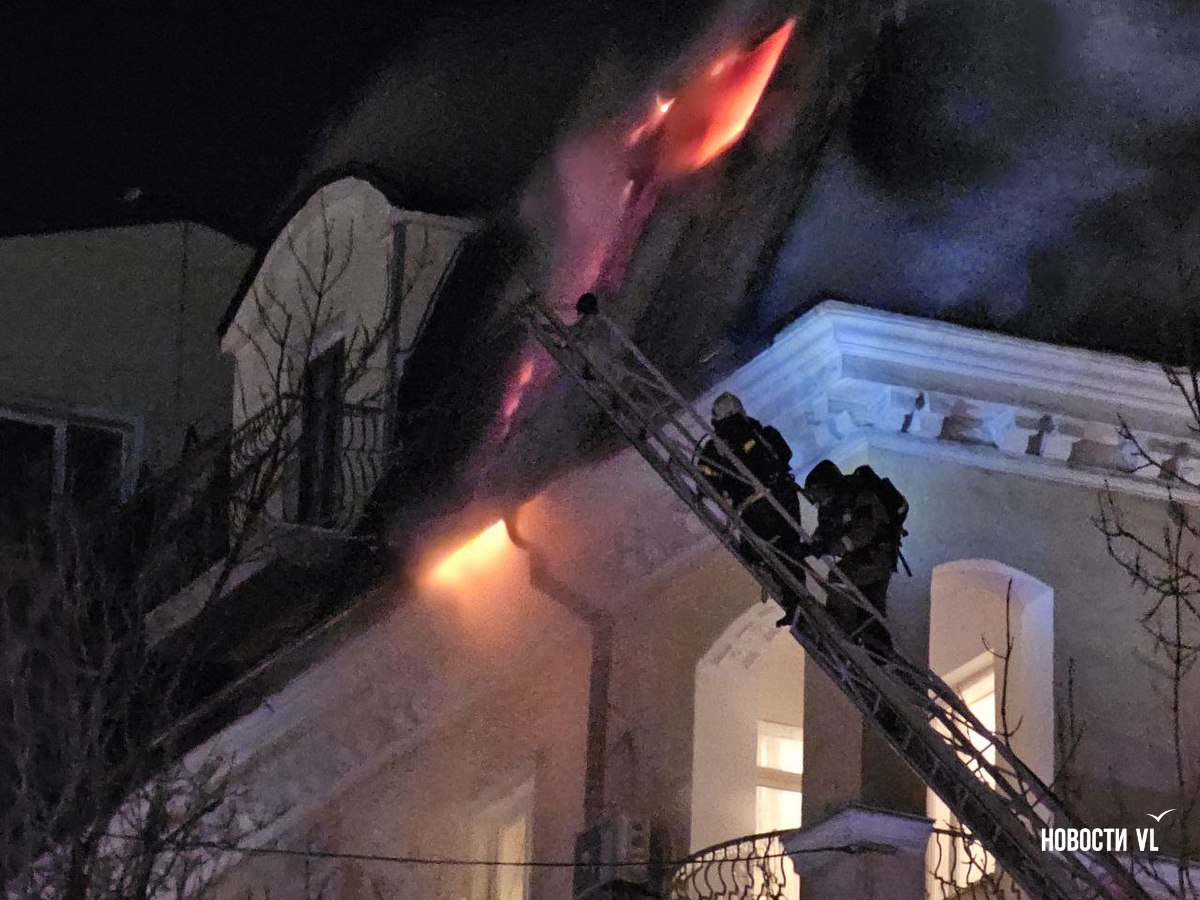 Вечером в среду, 3 декабря, во Владивостоке загорелся мансардный этаж жилого дома на Уборевича, 10а. Пожарное депо расположено прямо напротив, а соседнее здание – гимназия № 1. Пожарные пытаются потушить огонь, задействовав автолестницу.