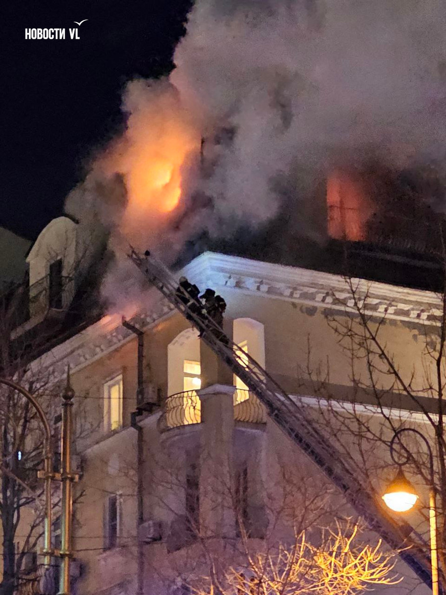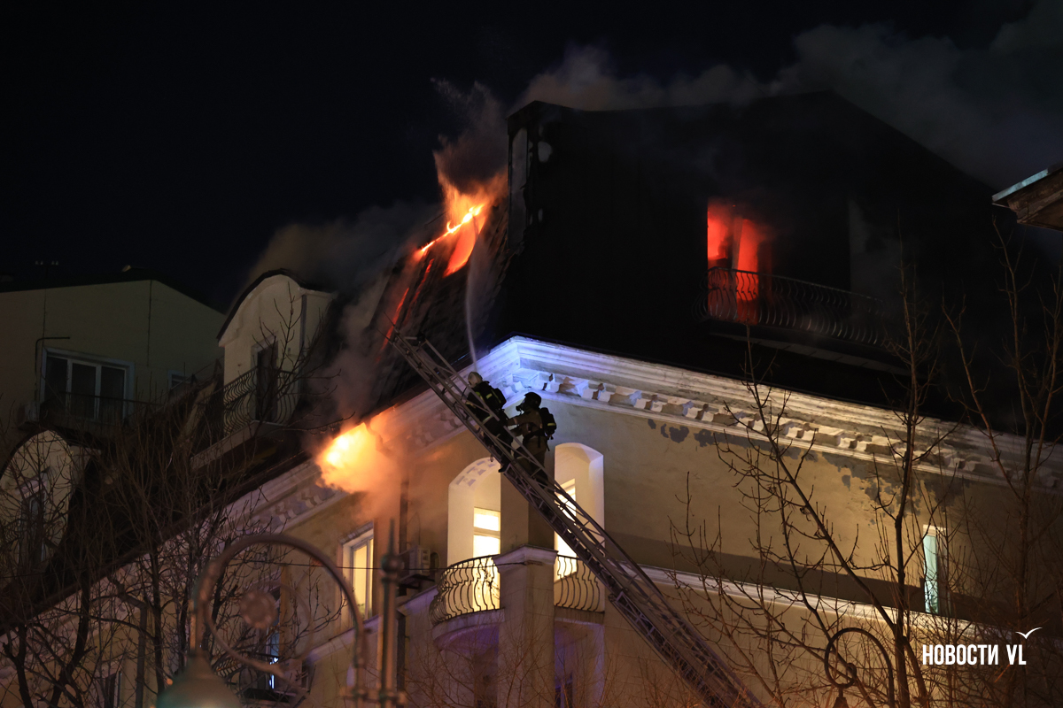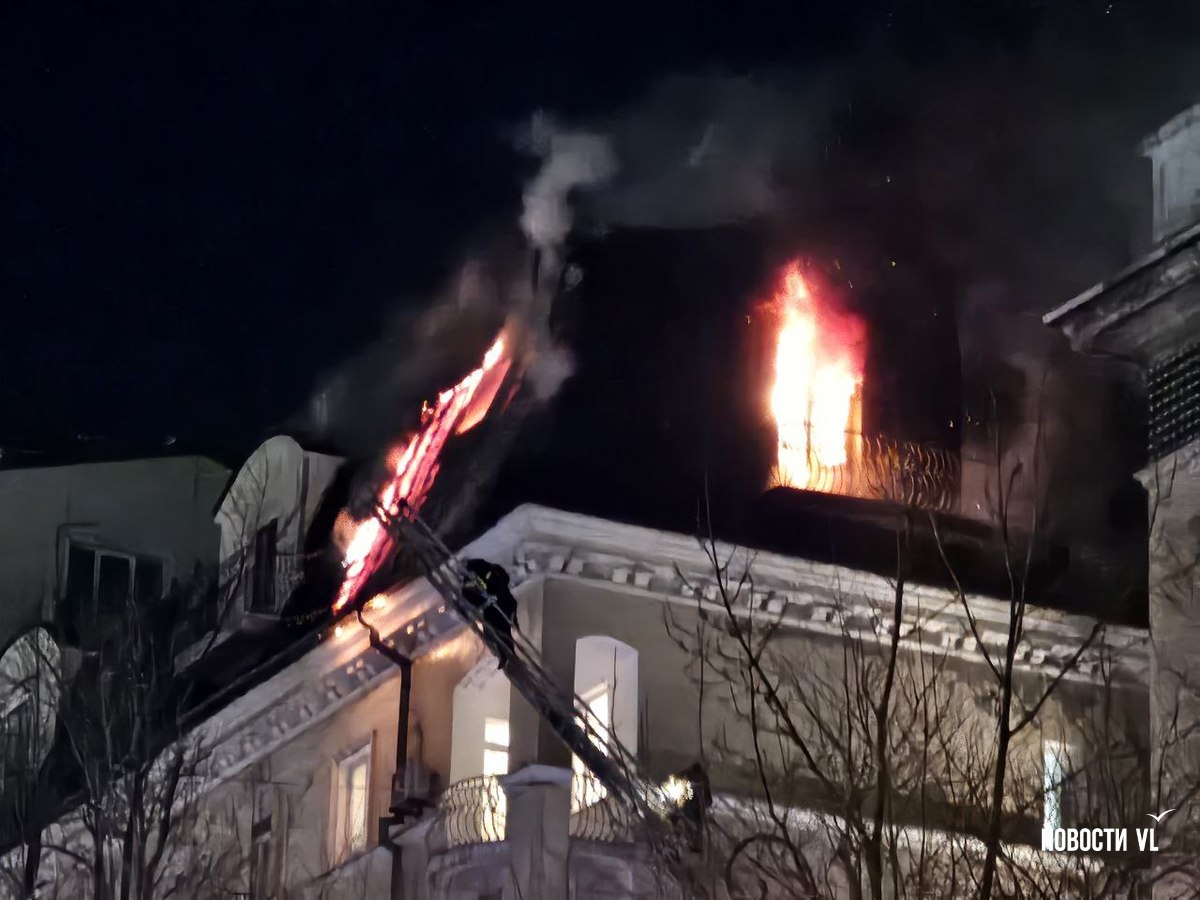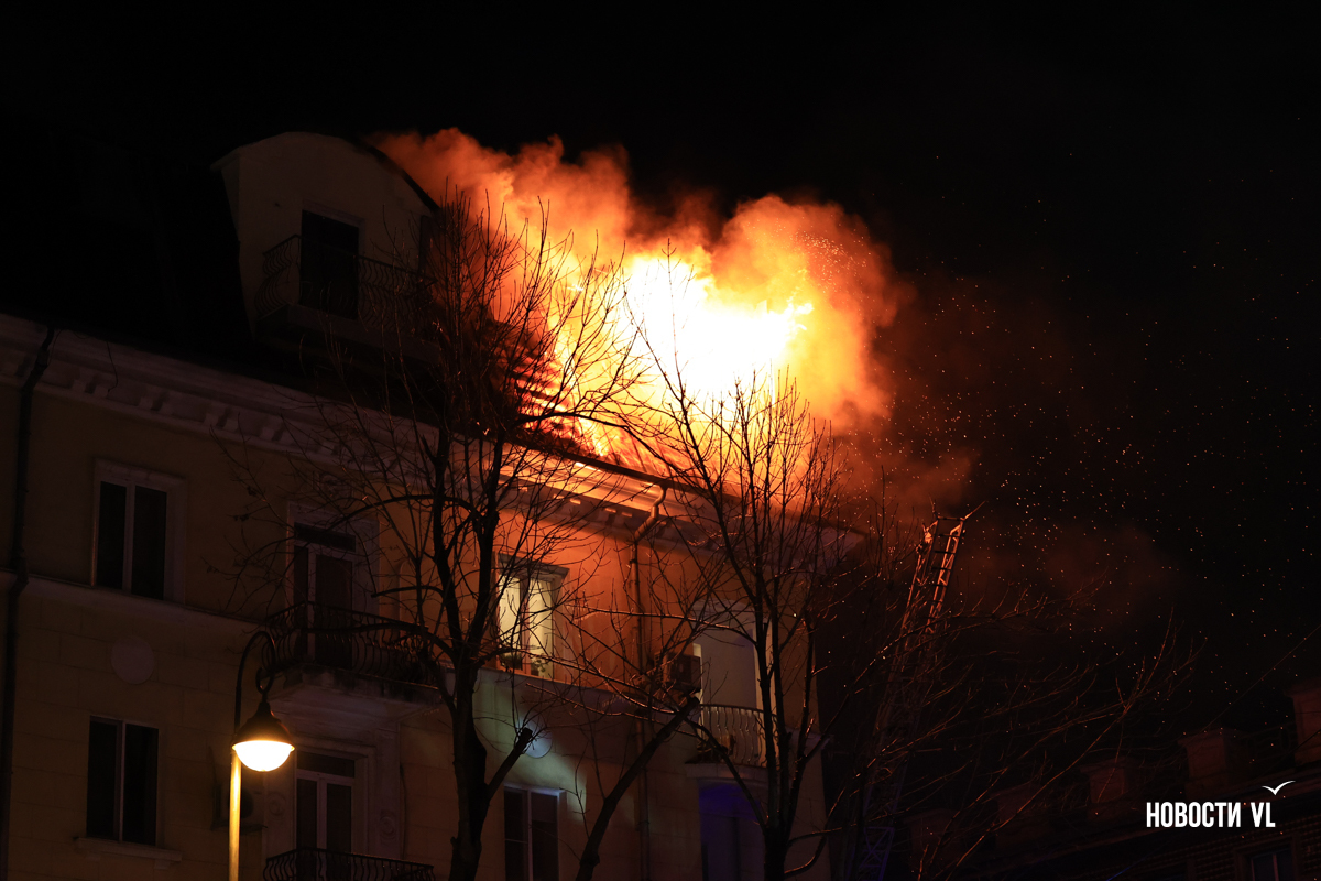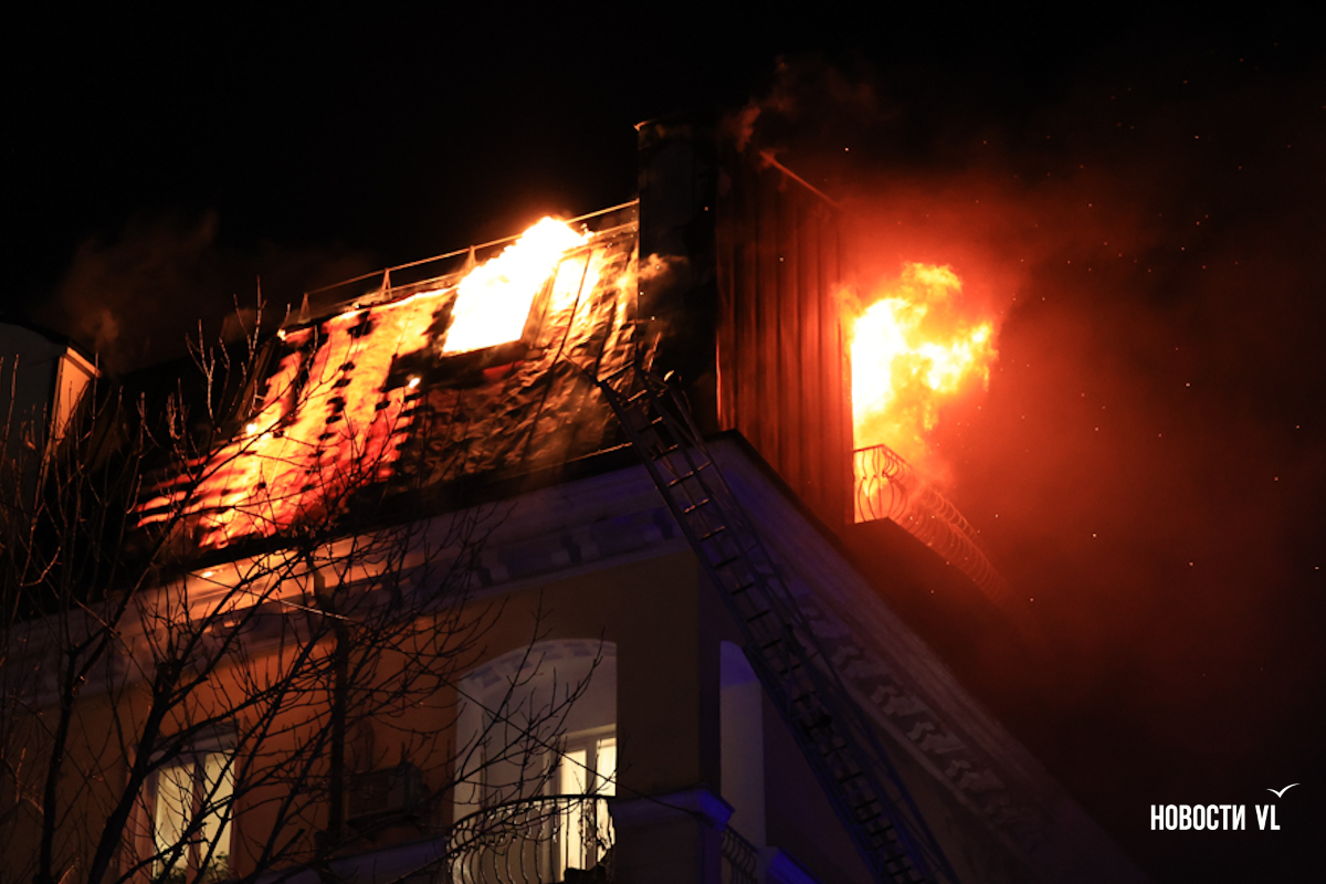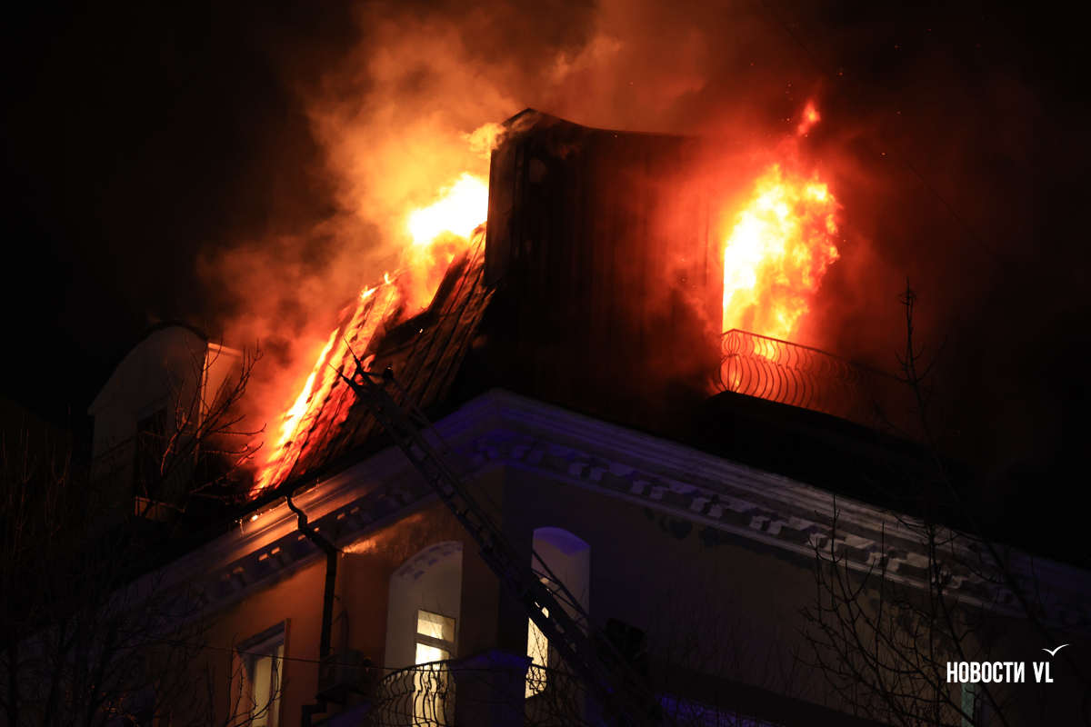 Вечером в среду, 3 декабря, во Владивостоке загорелся мансардный этаж жилого дома на Уборевича, 10а. Пожарное депо расположено прямо напротив, а соседнее здание – гимназия № 1. Пожарные пытаются потушить огонь, задействовав автолестницу.