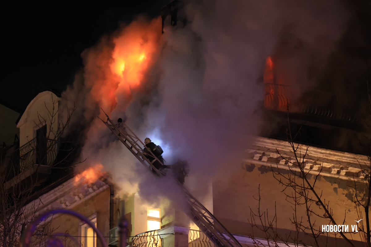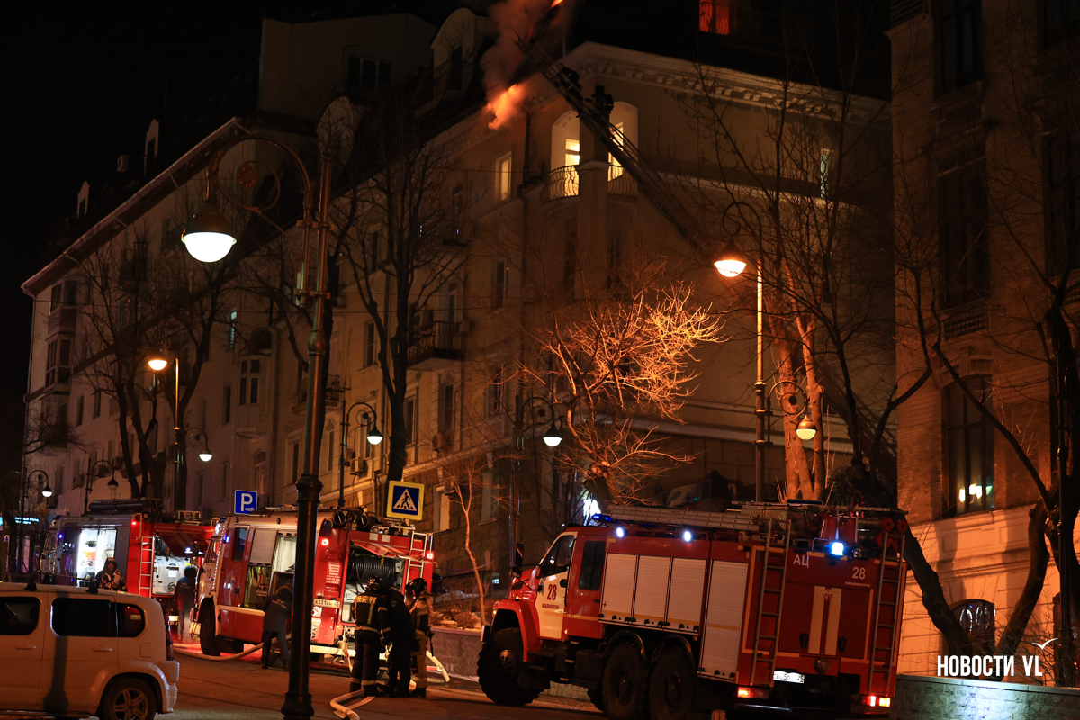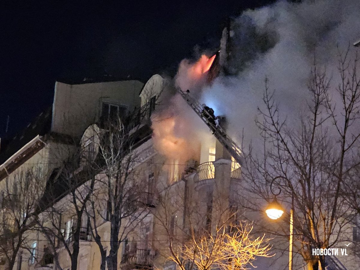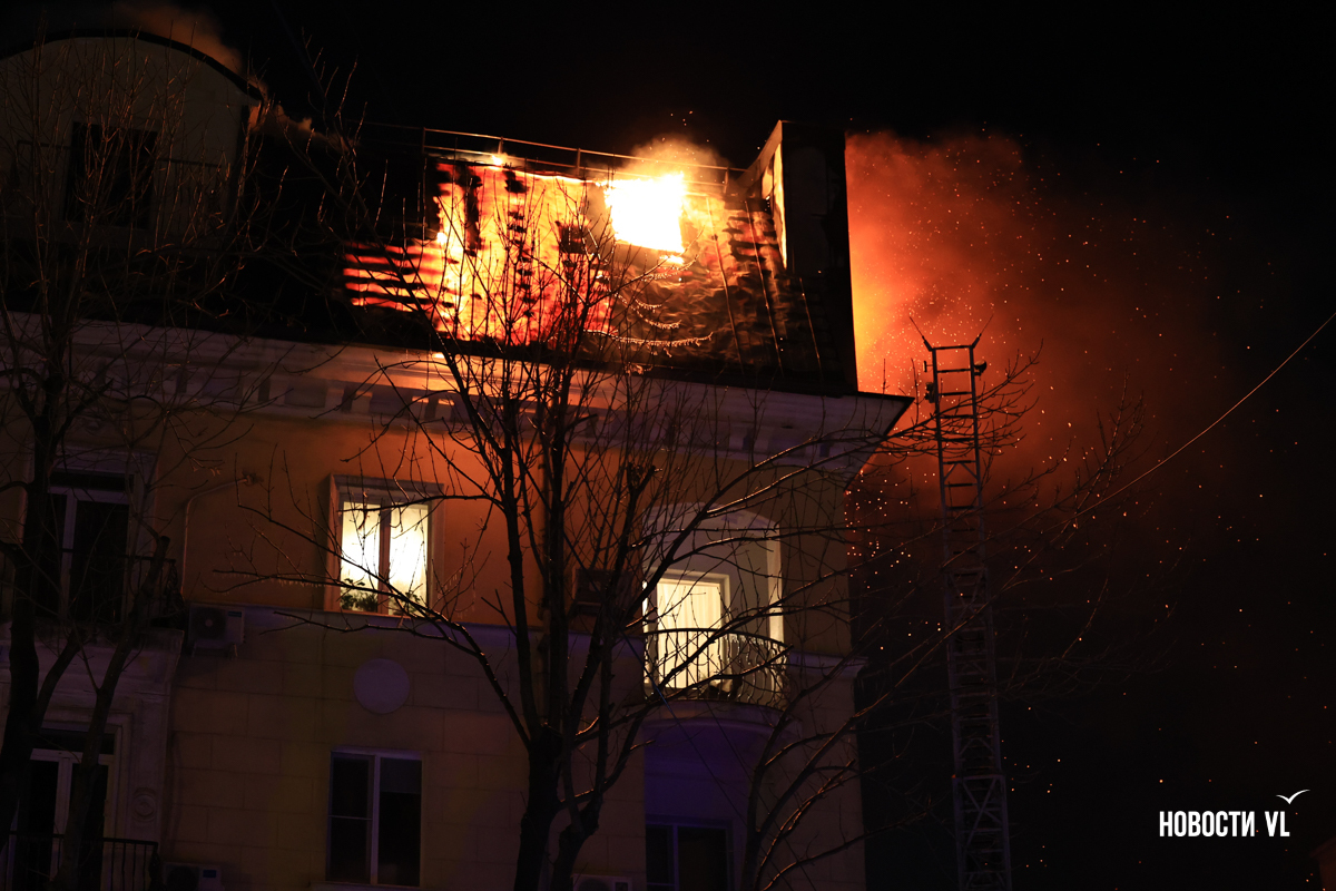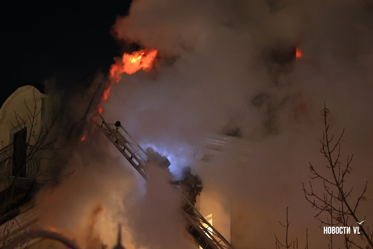 Вечером в среду, 3 декабря, во Владивостоке загорелся мансардный этаж жилого дома на Уборевича, 10а. Пожарное депо расположено прямо напротив, а соседнее здание – гимназия № 1. Пожарные пытаются потушить огонь, задействовав автолестницу.