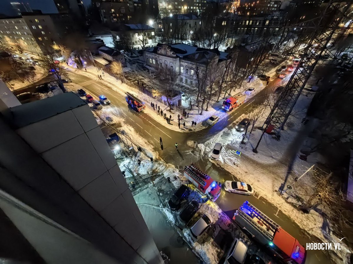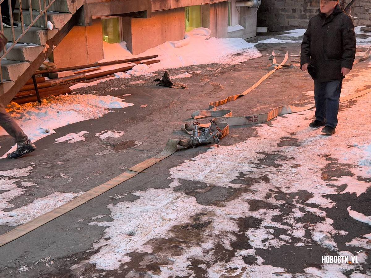 Огонь начинает ослабевать, здание изрядно прогорело. Из-под конструкций валит уже белый дым и пар, через них мелькают красные пятна. Улица Пограничная и Лесной переулок сильно залиты водой, как и внутренний двор Пограничной, 15в, откуда начинали тушить пожар. Сейчас вода замерзает, дорога превращается в каток. Пройти и проехать тут уже проблематично.