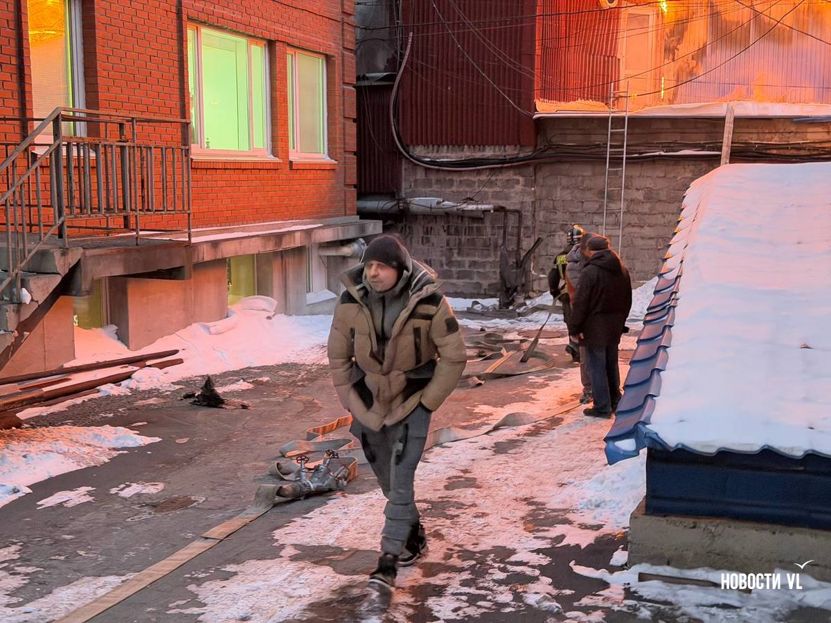 Есть опасность, что огонь перекинется на соседнее здание, Пограничная, 15а. Между ними очень малое расстояние, дым начинает постепенно наполнять соседний дом. Пожарные, все, кто сверху, выбегают быстро оттуда. После тушения прыгают в снег, чтобы как-то прийти в себя. Работают в данный момент в уже несколько стволов. Но все равно этого как будто недостаточно, огонь становится сильнее.