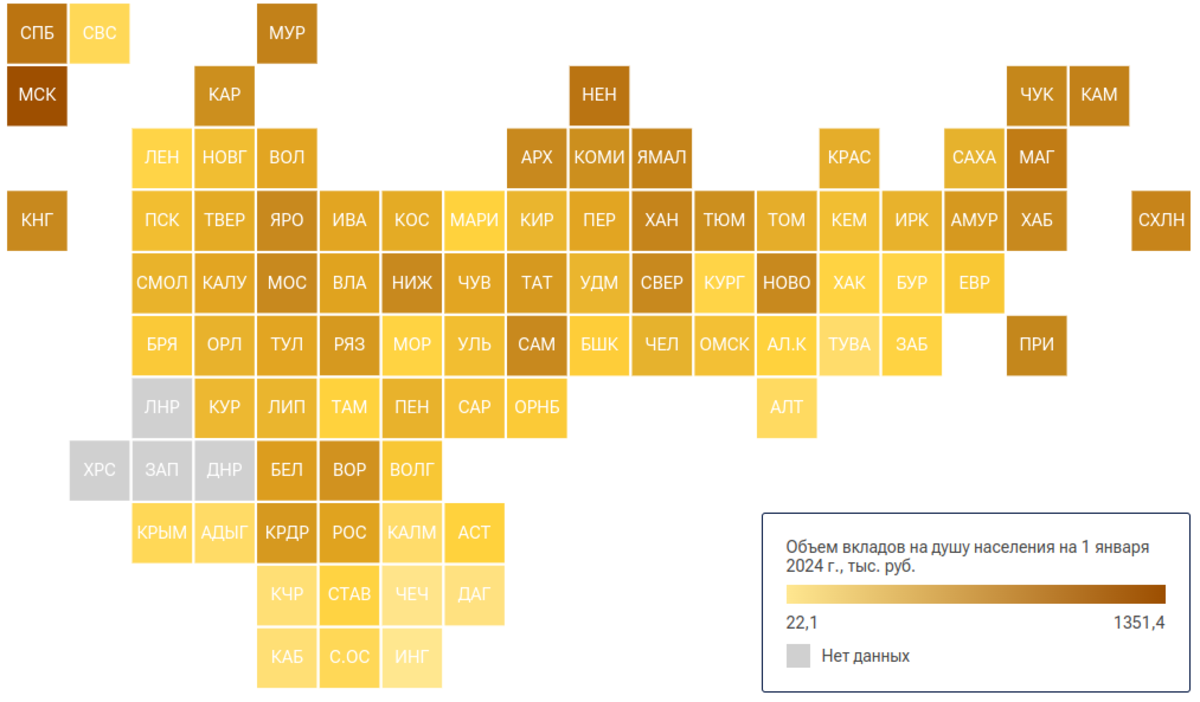 По итогам исследования РИА Рейтинг эксперты выяснили, что объём вкладов населения в российских банках на 1 января 2024 года составил 50,7 триллиона рублей. В пересчёте на одного жителя в России объём вкладов населения в банках в среднем составил 346,6 тысячи рублей. При этом в различных регионах страны ситуация крайне неоднородная: у лидера (Москвы) и замыкающего рейтинг региона (Ингушетии) средний объём вкладов на одного жителя отличается в 61 раз. Приморье занимает 11-ю позицию в рейтинге – в среднем жители края хранят на вкладах по 360,1 тысячи рублей. Среди дальневосточных регионов выше – Магадан (538,1 тысячи), Камчатка (445,2 тысячи), Сахалин (425,2 тысячи) и Чукотка (391,8 тысячи).