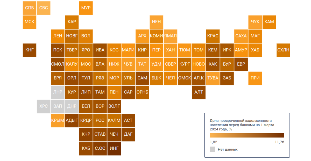 Как свидетельствуют результаты исследования РИА Новости, среди российских регионов наблюдается значительная дифференциация по доле просроченной задолженности по кредитам населению. По состоянию на 1 марта 2024 года доля просрочки между регионами варьируется от 2% до 12%, а медианное значение доли просроченной задолженности по кредитам населению равнялось 3,65%, против 4,39% на ту же дату прошлого года.