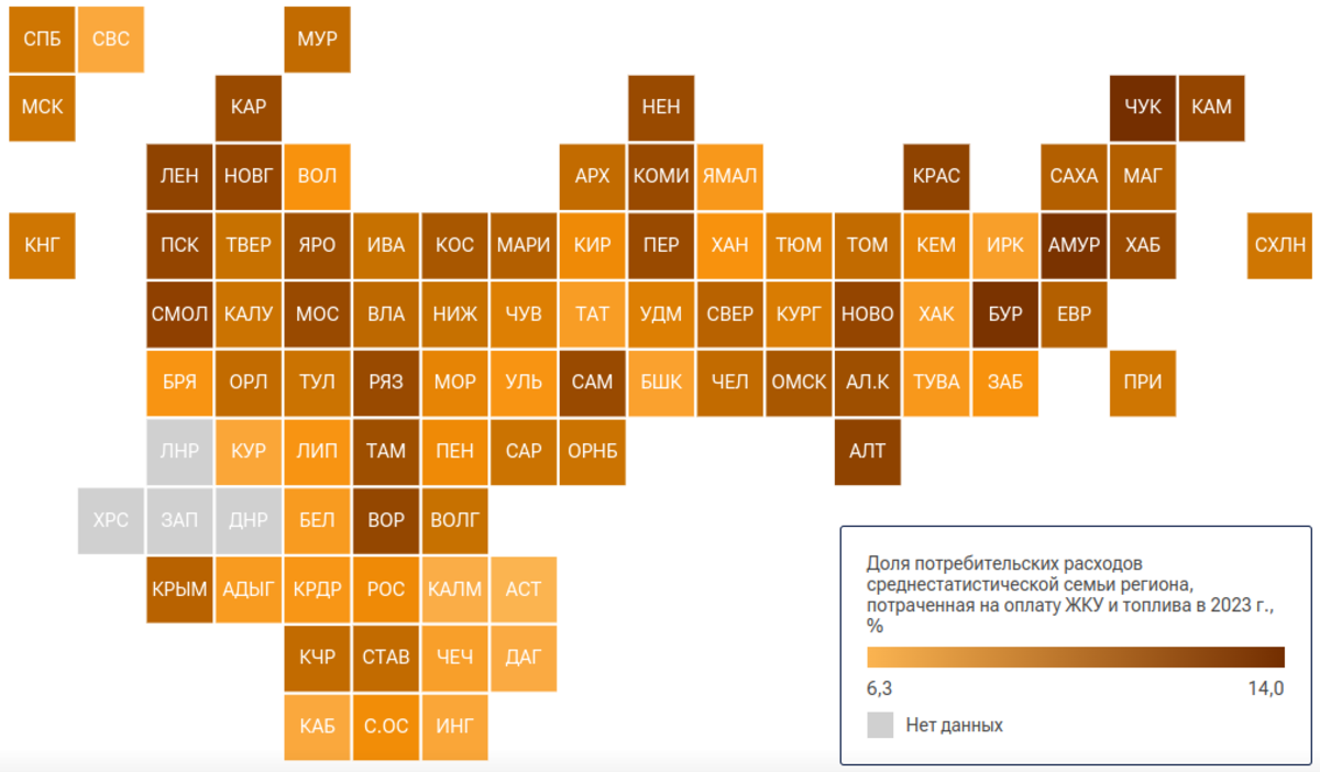 Самая большая доля расходов на ЖКУ, напротив, в регионах северных и дальневосточных, для которых топливо обходится дороже, а тратится его больше – в Чукотском автономном округе (14,0%), Республике Бурятия (13,4%) и в Амурской области (13,3%). Всего же свыше 10% своих потребительских расходов направляют на оплату ЖКУ жители 25 субъектов РФ.