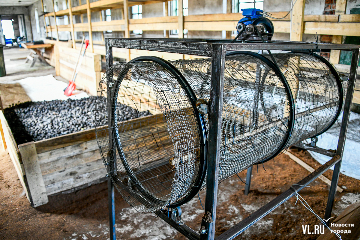 А ещё будет линия автоматического посева. Начальник питомника показывает, как к нему здесь готовились. Для этого в старом здании, которое рассчитывают отремонтировать, установили самодельный барабан с ячейками: