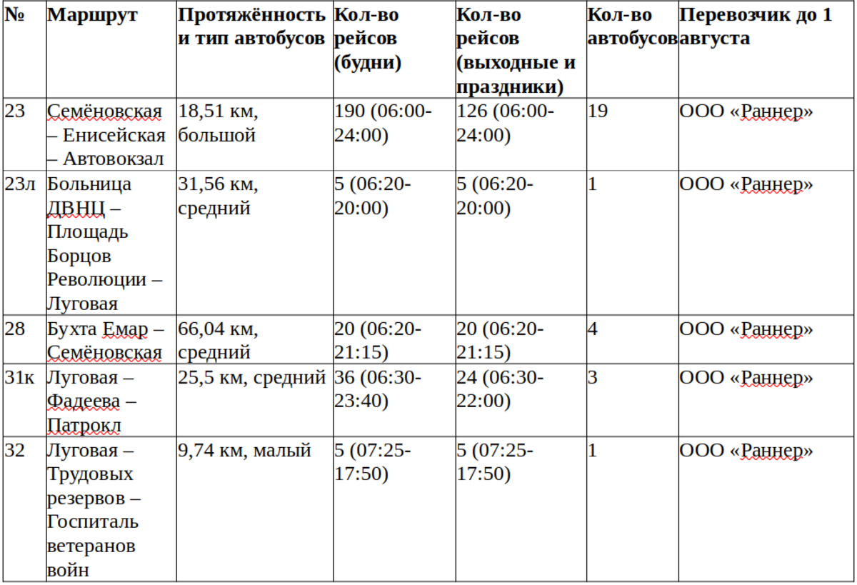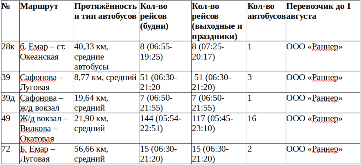 Контракт на маршруты № 28к, 39, 39д, 49 и 72 сейчас обслуживает «Раннер». Восемь месяцев работы нового перевозчика оцениваются в 27,15 млн рублей. Пять маршрутов имеют общую протяжённость 147,3 км. Все автобусы должны быть средними, то есть минимум на 17 сидячих мест (а минимальная пассажировместимость – 40 человек). Здесь увеличили автобус до Емара от Океанской – в прошлом контракте был малый, теперь будет средний, но всё равно один.
