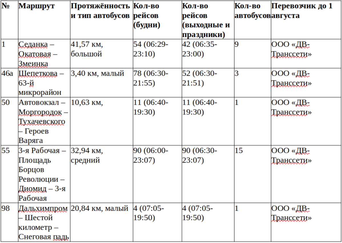 Контракт на маршруты автобусов № 1, 46а, 50, 55 и 98 тоже не содержит ничего нового. Его выполняет сейчас компания ООО «ДВ-Транссети». Новые перевозки оценивают в 39 млн рублей. Общая протяжённость всех маршрутов, среди которых очень популярный 55-й, составляет 109,38 км.
