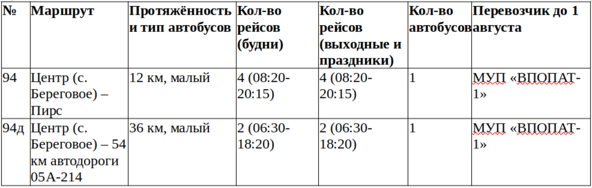 Совсем маленький контракт – на автобусы в селе Береговом, № 94 и 94д. Обслуживает их МУП «ВПОПАТ-1». Сейчас № 94д вообще не ходит – понять несложно, это маршрут от посёлка до трассы, почти 20 км по грунтовке в одну сторону. Этот маршрут, соответственно, и не оплачивается. Работы оцениваются чуть больше чем в 1 млн рублей. Общая протяжённость двух маршрутов 48 км. Количество и размер автобусов не изменятся.