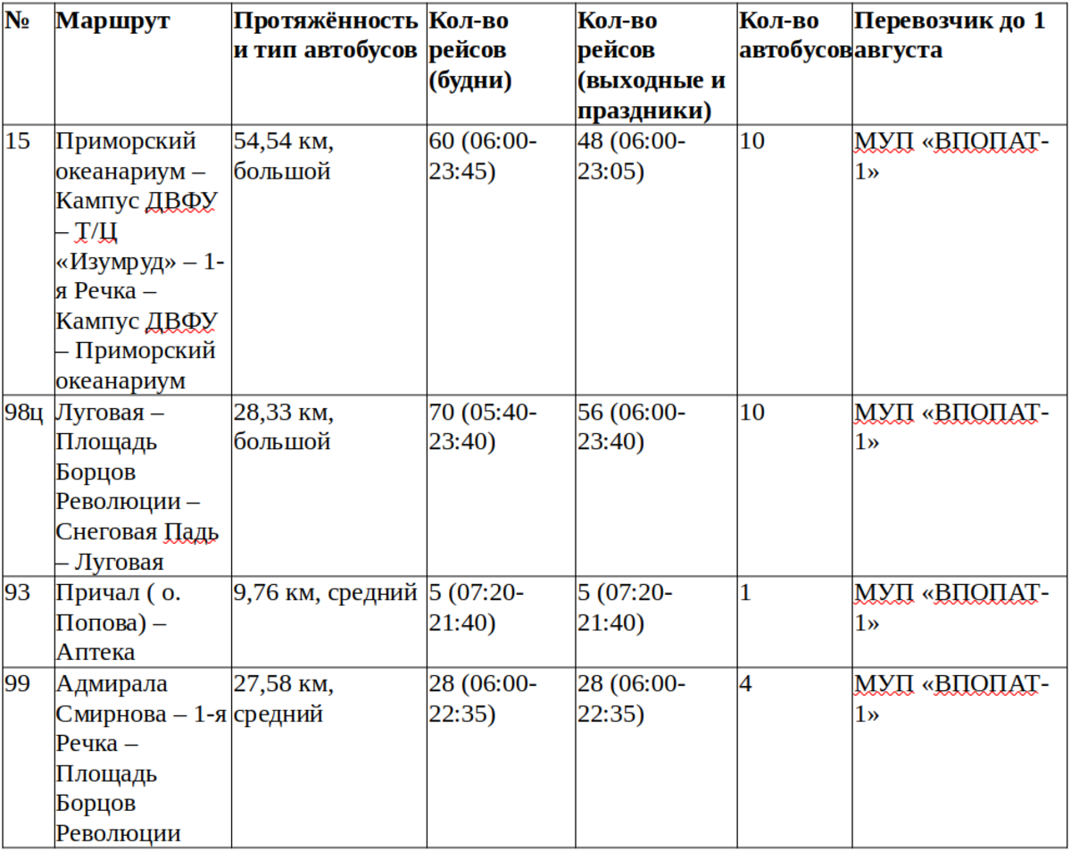 Маршруты № 15, 93, 98ц и 99 оценивают в 53,33 млн рублей. Сейчас их обслуживает МУП «ВПОПАТ-1», и несмотря на то, что маршрутов всего четыре, протяжённость их 120,21 км, они считаются очень сложными. Это автобусы от Снеговой Пади до Луговой и до центра, по острову Попова, от океанариума на Первую Речку и обратно.