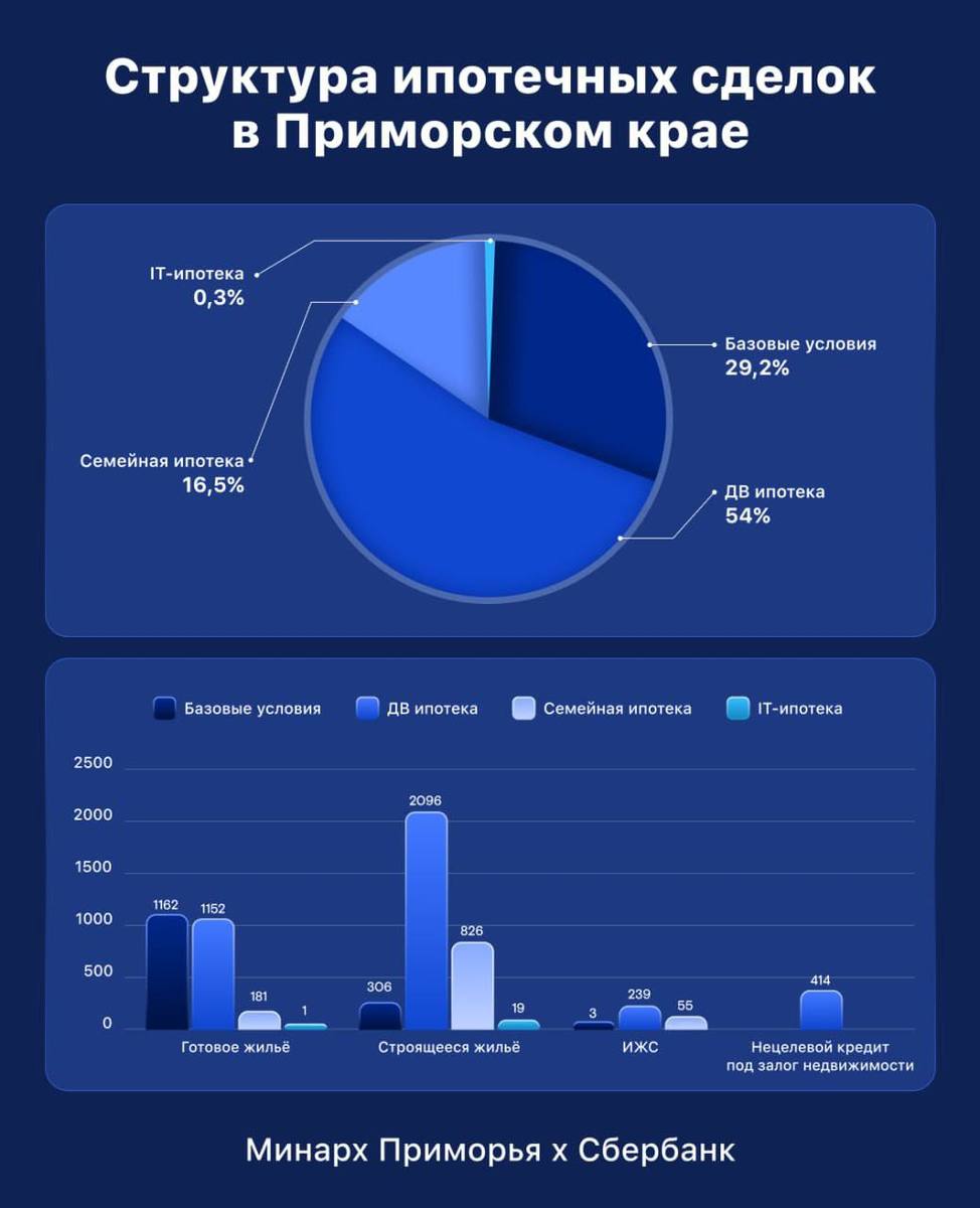 Однако в Приморском крае, по данным министерства архитектуры и градостроительства и Сбербанка, самой популярной остаётся «Дальневосточная ипотека» под 2% и меньше. На неё пришлось 54% сделок в этом году. На втором месте – ипотека на базовых условиях, или рыночная ипотека, без господдержки, под 21% в среднем. «Семейная ипотека» – всего лишь третья по популярности. Её брали 16,5% заёмщиков. 826 человек взяли её на строящиеся квартиры, 181 – на готовые, 55 – на строительство частного дома.