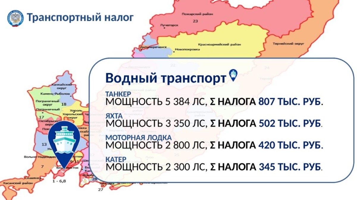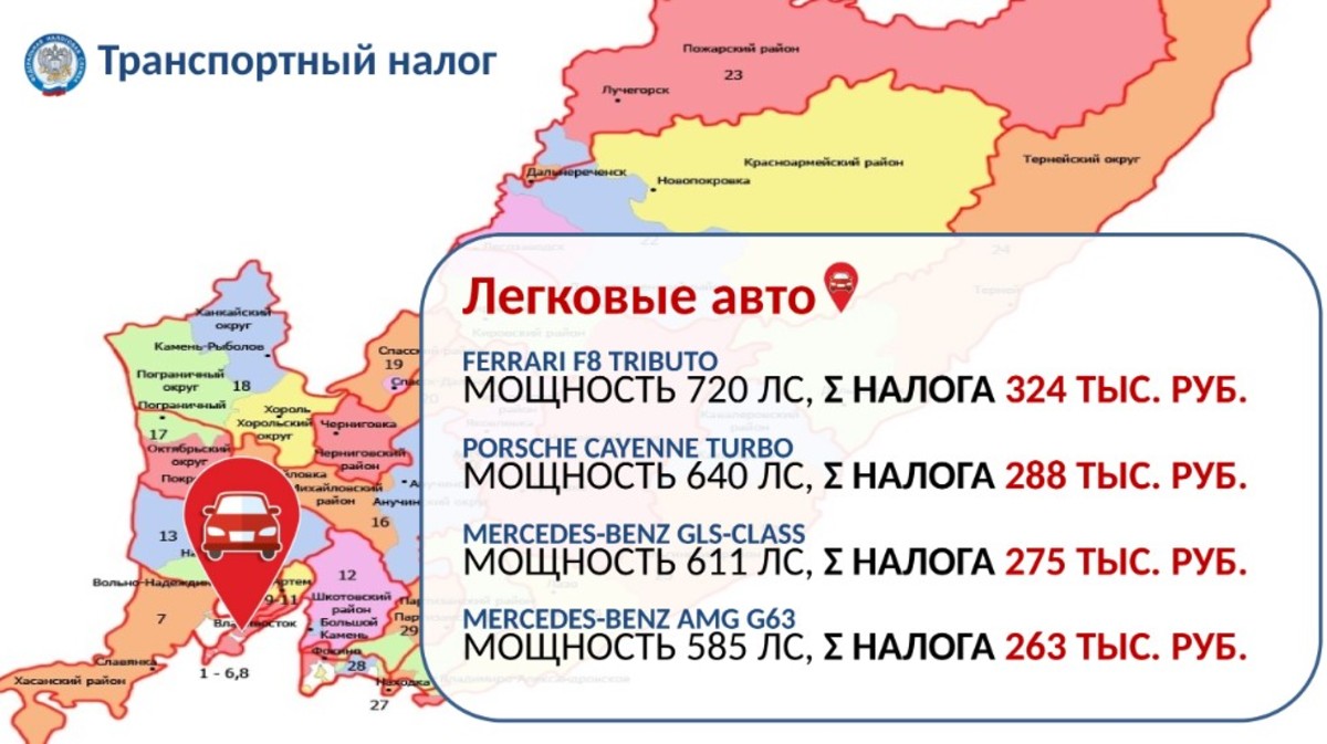 На пресс-конференции, посвящённой исполнению налоговых уведомлений рассказали, что в этом году самый большой начисленный транспортный налог на автомобили в Приморье – 324 тысячи рублей за Ferrari F8 Tributo с двигателем мощностью 720 л. с. Второе место у Porsche Cayenne Turbo – 288 тысяч рублей за 640 л. с. В прошлом году лидером стал Lamborghini Urus, на который насчитали 300 тысяч. Но транспортный налог с «физиков» – это не только машины.