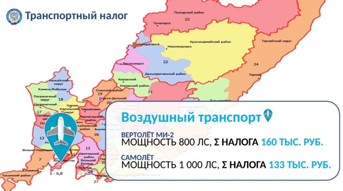 Самые большие налоги на дом и землю в этом году должны будут заплатить два жителя Владивостока. Это больше 2 миллионов рублей в общей сложности. Рекорды по транспортным налогам поставили владельцы Ferrari и Porsche Cayenne. Им начислили больше, чем за частный самолёт и вертолёт «Ми-8». А два счастливчика выиграли в казино более 10 миллионов рублей каждый – 15% от этой суммы уйдут на налоги.