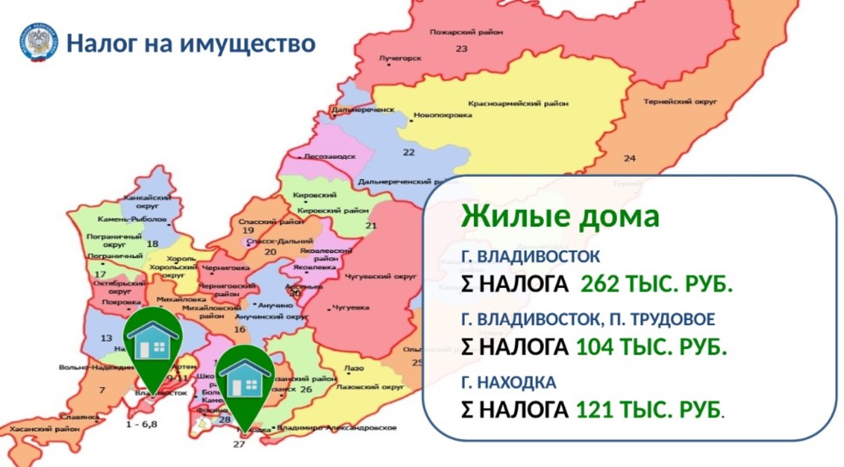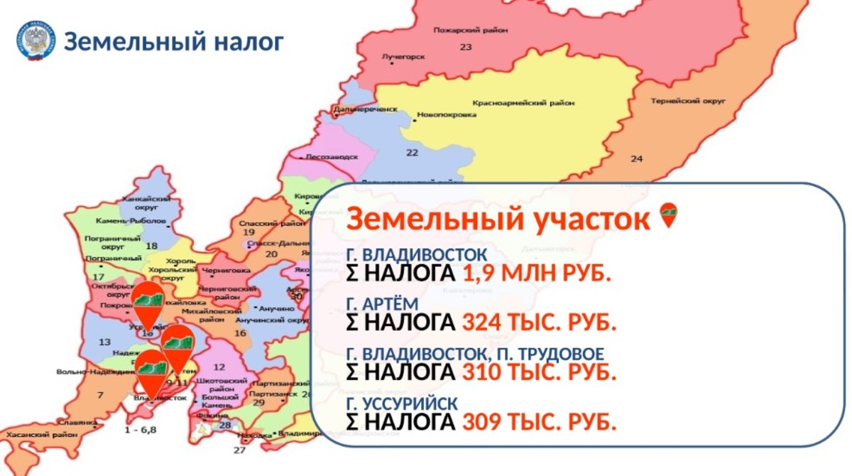 Самый высокий земельный налог заплатил житель Владивостока – 1,9 млн рублей. Рекорд налога на дом – тоже у жителя краевой столицы – 262 тысячи рублей.