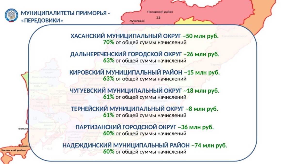 Всего приморцам направлено около 830 тысяч сводных налоговых уведомлений – их получило больше половины населения края. К середине ноября больше всего налогов заплатил Хасанский район – 70% от суммы начислений, или 50 миллионов рублей. Всего на доске почёта – семь муниципалитетов, но Владивостока среди них нет.