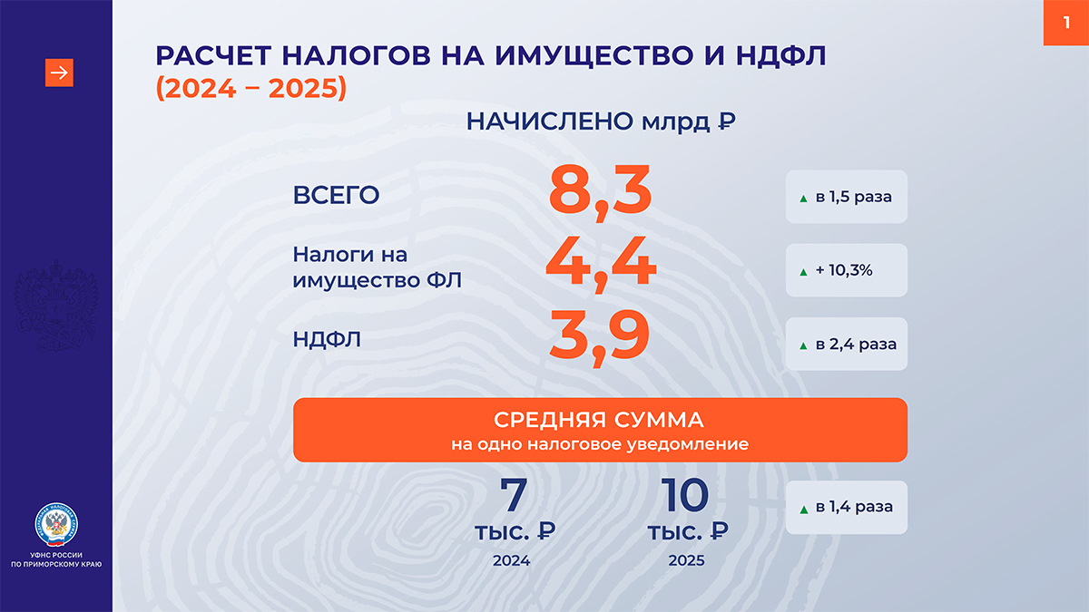 Имущественные налоги с физических лиц – это прежде всего пополнение местного бюджета, из них формируется примерно 40% доходной части бюджета Владивостока и Приморского края. И специалисты фиксируют стабильный прирост поступлений. В 2023 году это было 3,6 млрд рублей, в 2024-м – 3,9 млрд, а в нынешнем году прогнозируют 4,4 млрд.