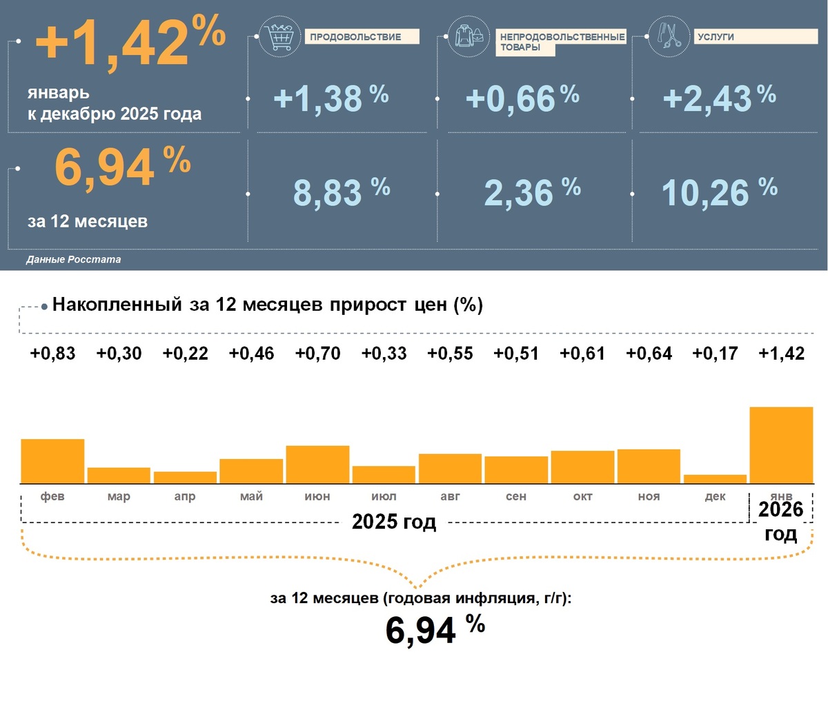 По данным Росстата, после длительного снижения годовая инфляция в России в январе 2026 года ожидаемо повысилась. Однако это не разворот тренда, а результат влияния разовых факторов. После их исчерпания инфляция вновь замедлится. По прогнозу Банка России, в 2026 году она снизится до 4,5–5,5%, а в 2027 году и в дальнейшем будет находиться на цели вблизи 4%.