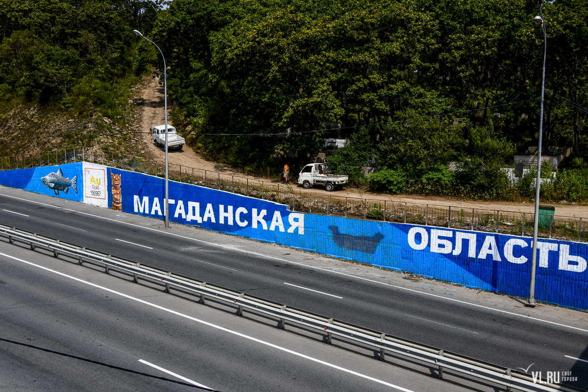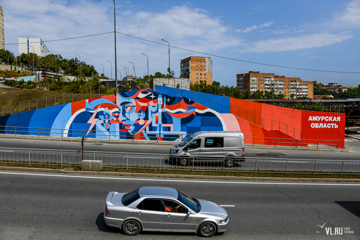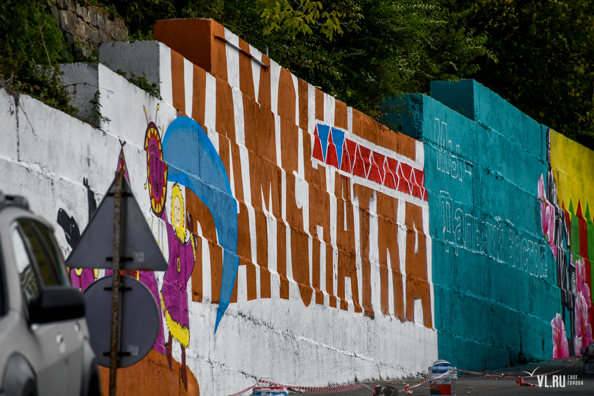 В среду, 25 августа, большая часть работ проекта «Мы – Дальний Восток» закончена. На главных владивостокских улицах от Маковского до въезда на Русский мост теперь можно увидеть изображения, презентующие все 11 дальневосточных регионов. Всего с начала августа было расписано более 3000 кв. м подпорных стен.