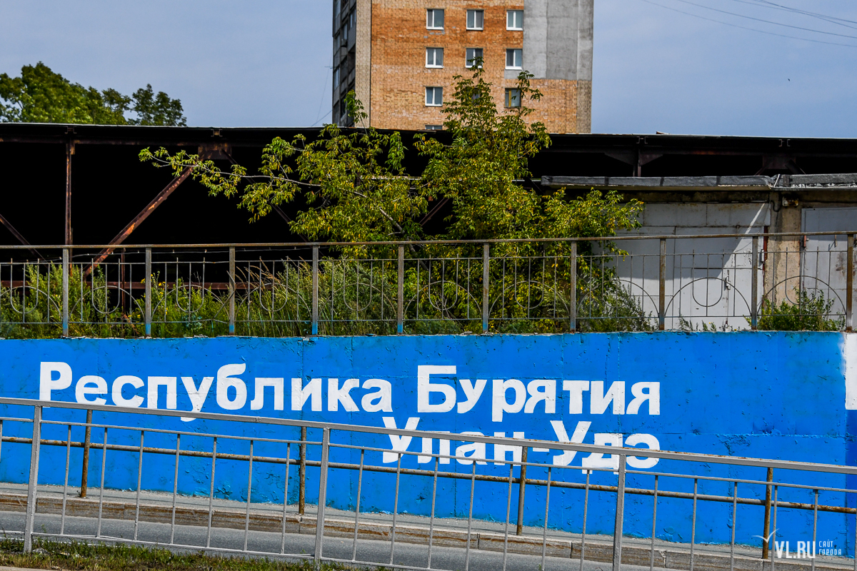 Если не подниматься к Запорожской, а продолжать движение к Русскому острову, то по левой стороне на двух подпорках (в районе Героев-Тихоокеанцев, 5а) вы увидите изображения Бурятии и Амурской области. В первом случае нарисованы виды Улан-Удэ – прогулочные зоны, здания, в том числе буддийские храмы, юрты в степях. А Амурская область – концептуальный красно-сине-белый рисунок, в котором можно разглядеть девушку, значок молнии и космическую ракету.