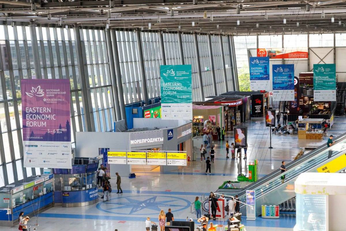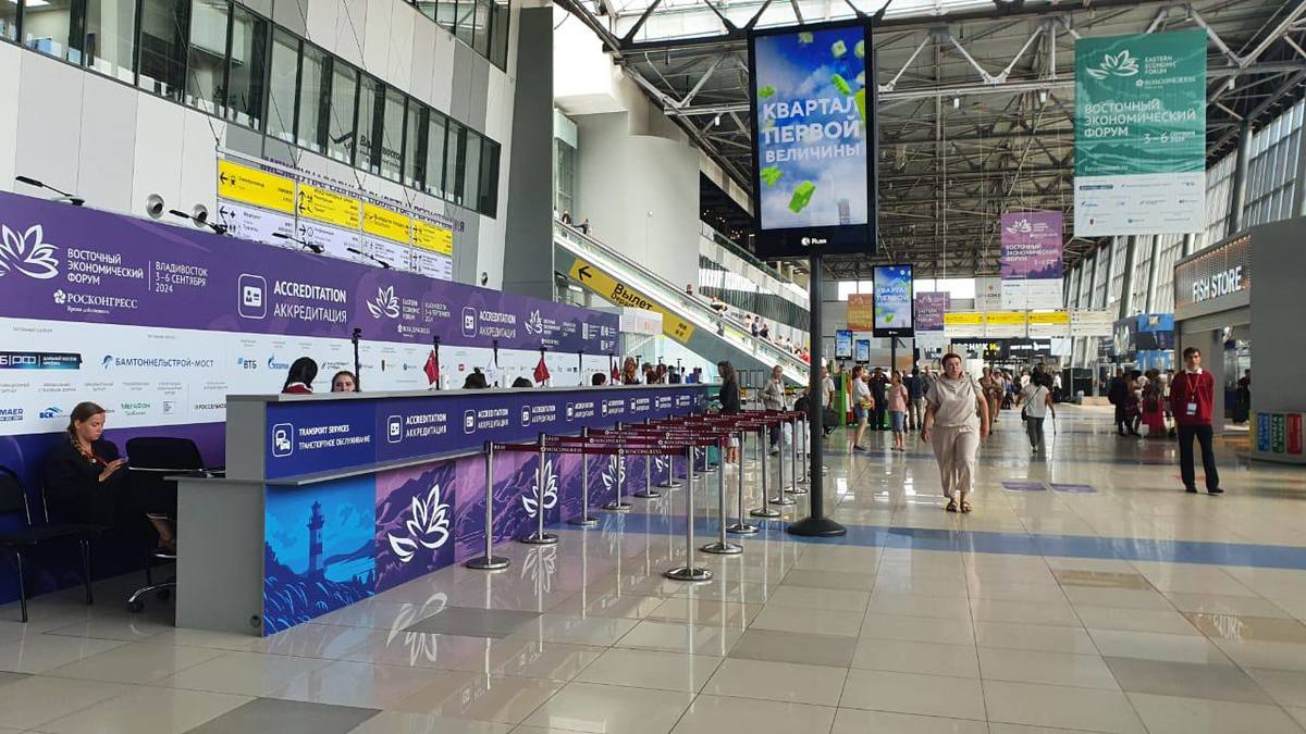 В аэропорту Владивостока усилены меры транспортной безопасности, открыты пункты аккредитации делегатов форума, работают волонтёры.