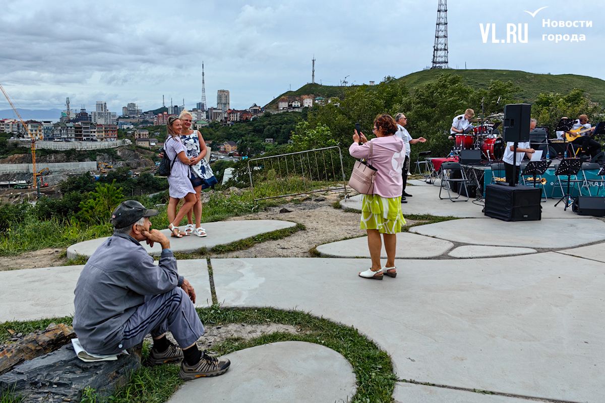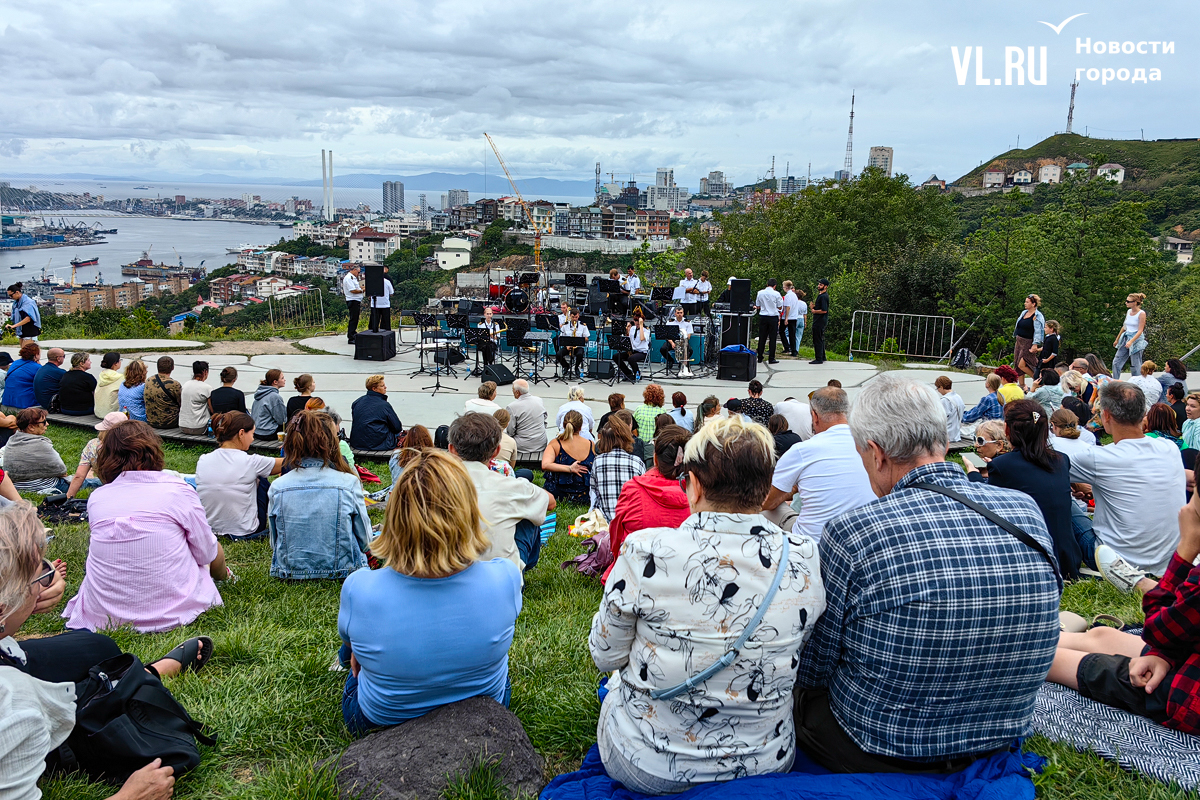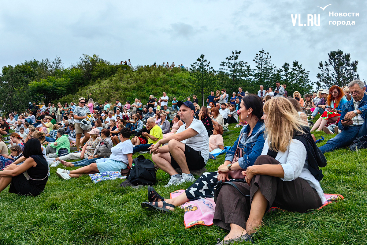 Поднимаясь на видовую площадку, гости поговаривали, что вчера даже сесть некуда было, поэтому приехали пораньше – и всё равно полно людей. Кофейни внизу задолго до концерта собрали очередь, как и туалеты. На сопке действительно все лавочки, лужайка и даже все камни были заняты. Кто-то прихватил покрывала и коврики. Многие стояли, дети сидели прямо на самокатах.