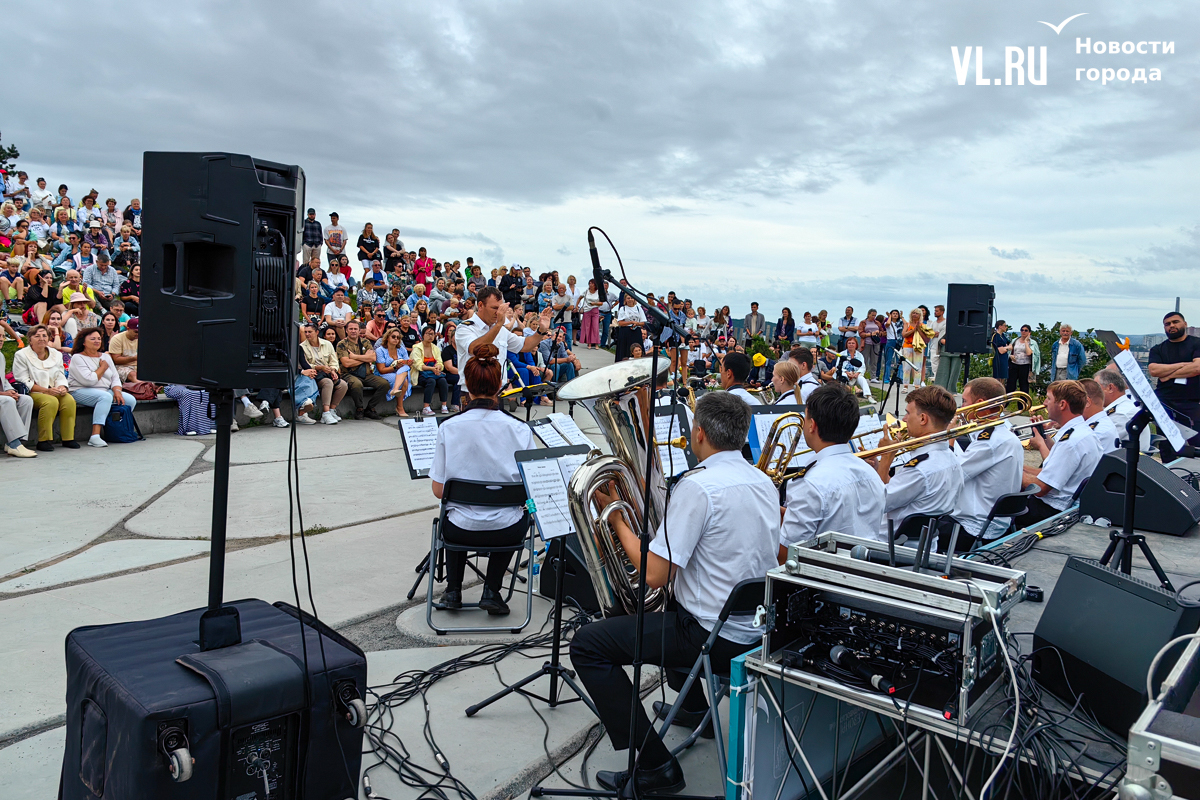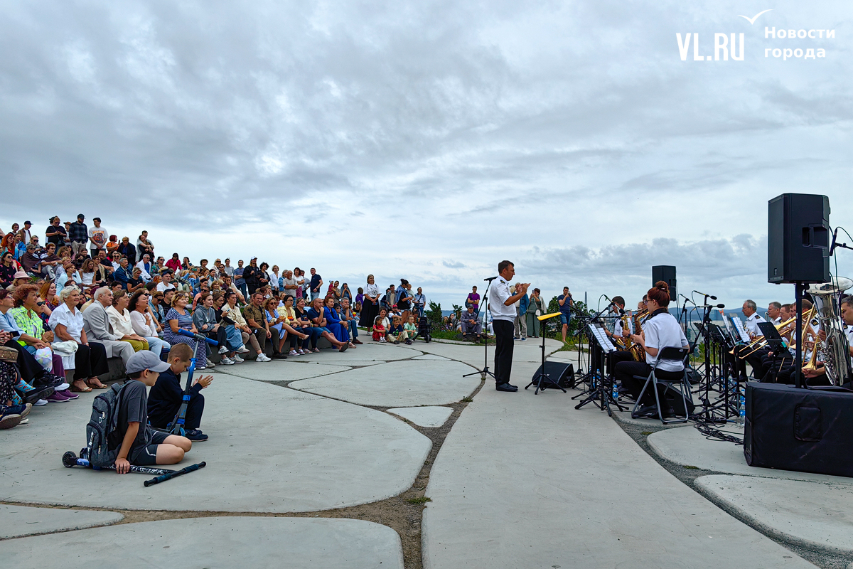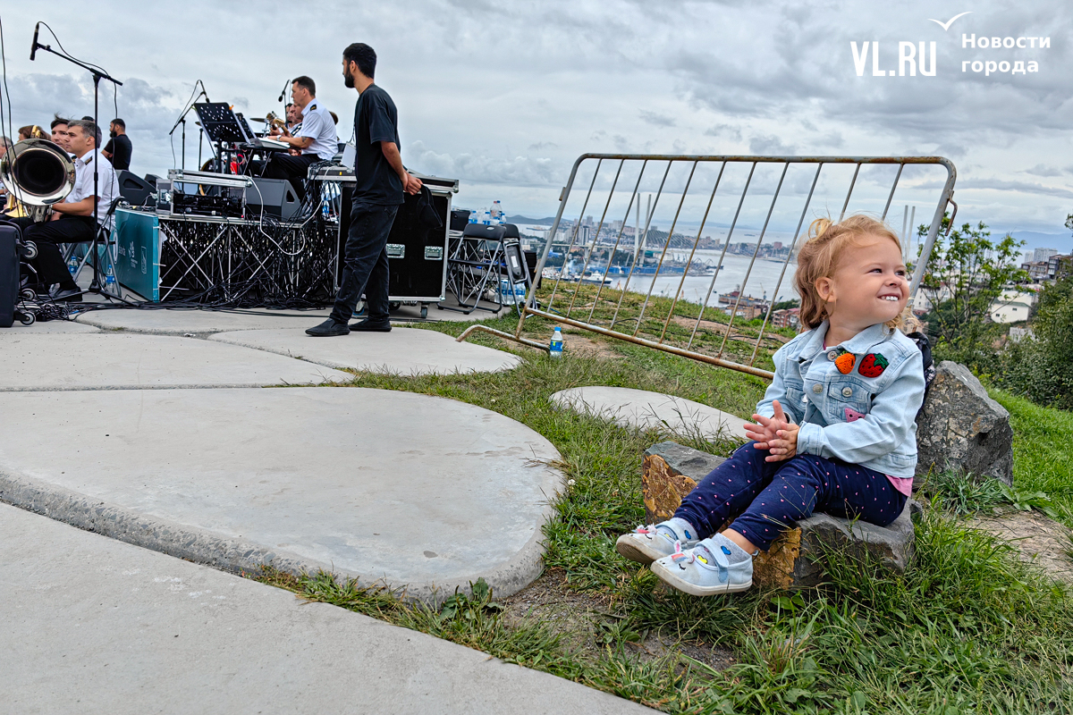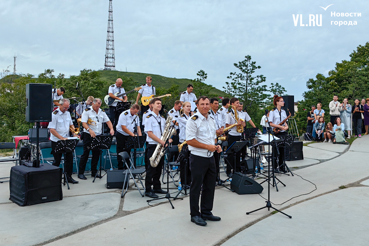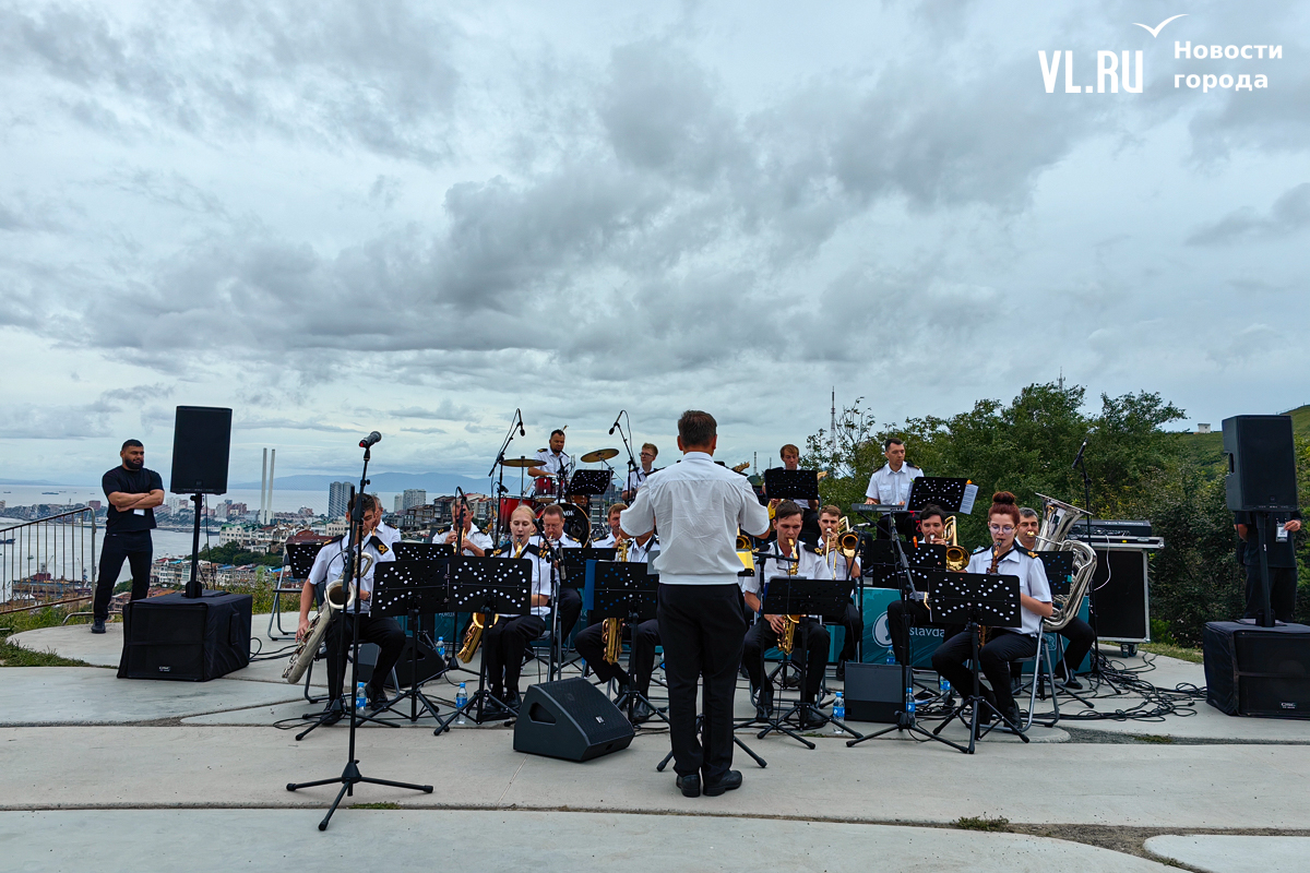 В рамках ВЭФ в Нагорном парке второй день подряд играют джаз с видом на город. Сегодня здесь выступал оркестр МГУ им. адм. Г. И. Невельского и и Дальневосточного филиала ФГУП «Росморпорт». Зрителей было много, люди слушали даже стоя. В этот вечер музыканты сыграли 13 прекрасных мелодий.