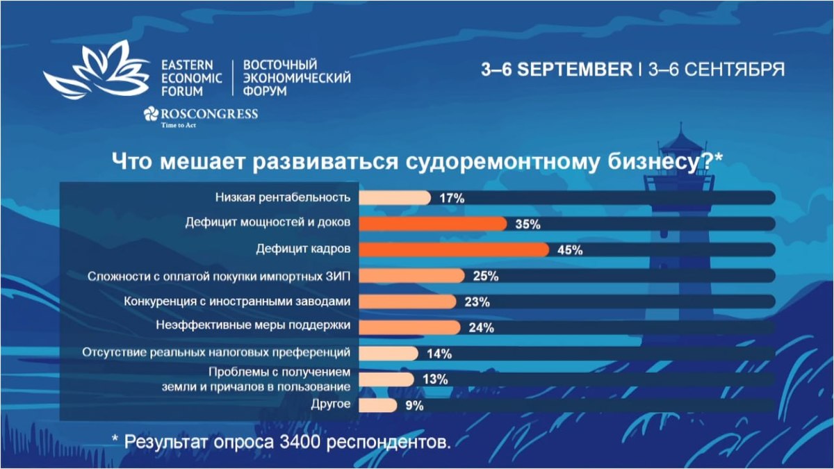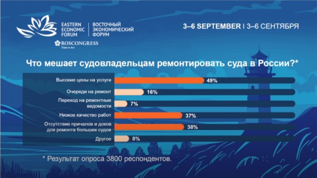 Сессия ВЭФ о судоремонте началась с результатов опроса, который проводила Всероссийская ассоциация рыбохозяйственных предприятий, предпринимателей и экспортёров (ВАРПЭ). Их представил председатель ассоциации и модератор сессии Герман Зверев. Что мешает судовладельцам ремонтировать свои суда в России? 49% респондентов ответили, что это высокие цены. На втором и третьем месте с почти одинаковыми показателями 37 и 38% идут соответственно низкое качество работ и отсутствие инфраструктуры для ремонта больших судов – доков, причалов. Очереди на ремонт, новшество в виде ремонтных ведомостей и всё остальное в целом не так сильно беспокоят отрасль.