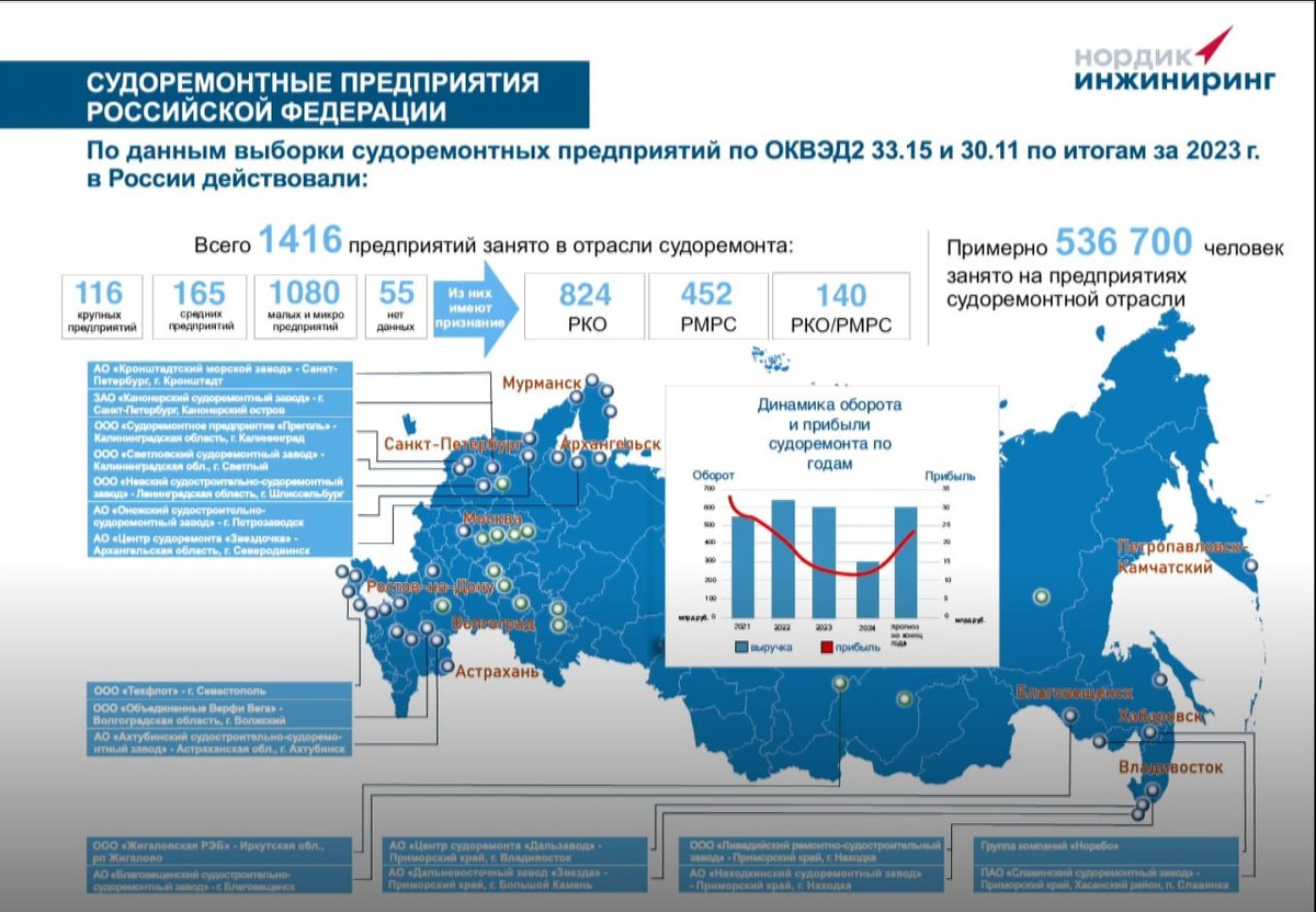 «Судоремонт является недооценённым с точки зрения регуляторной политики, хотя это могло бы существенно улучшить положение дел, – считает Николай Шабликов, председатель совета директоров АО «Нордик Инжиниринг». – Законодатели говорят, что это некая «серая зона», которую очень сложно регулировать и предлагать для неё меры поддержки. При этом что такое судоремонт в цифрах? У нас есть порядка 1400 предприятий на всю страну, которые занимаются ремонтом и техническим обслуживанием флота. В судостроении занято около 500 компаний. 536 тысяч человек занято в отрасли судоремонта, а в судостроении около 160 тысяч напрямую и 500 тысяч у «смежников».