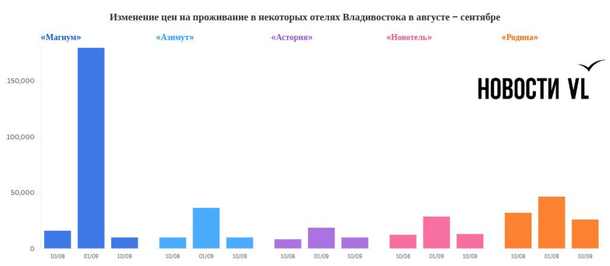В гостинице «Магнум» номер в начале августа стоил около 16 тысяч рублей за ночь. С 3 по 7 сентября цена поднимается до 180 тысяч рублей. После 11 сентября она резко снижается – до 10 тысяч.