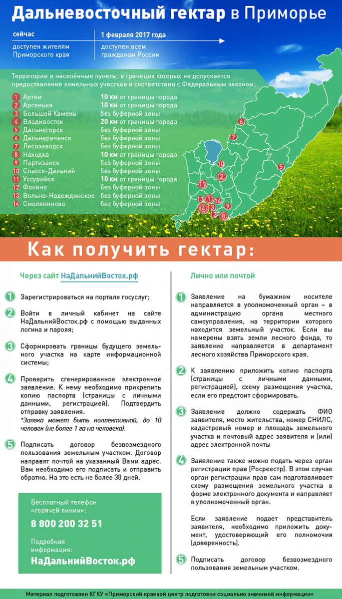 С 1 октября расширяется территория, на которой можно получить бесплатный гектар. Теперь выбрать участок кроме Ханкайского района можно и на остальной территории Приморья, за исключением Владивостока, Находки и других крупных населенных пунктов края и территории рядом с ними.