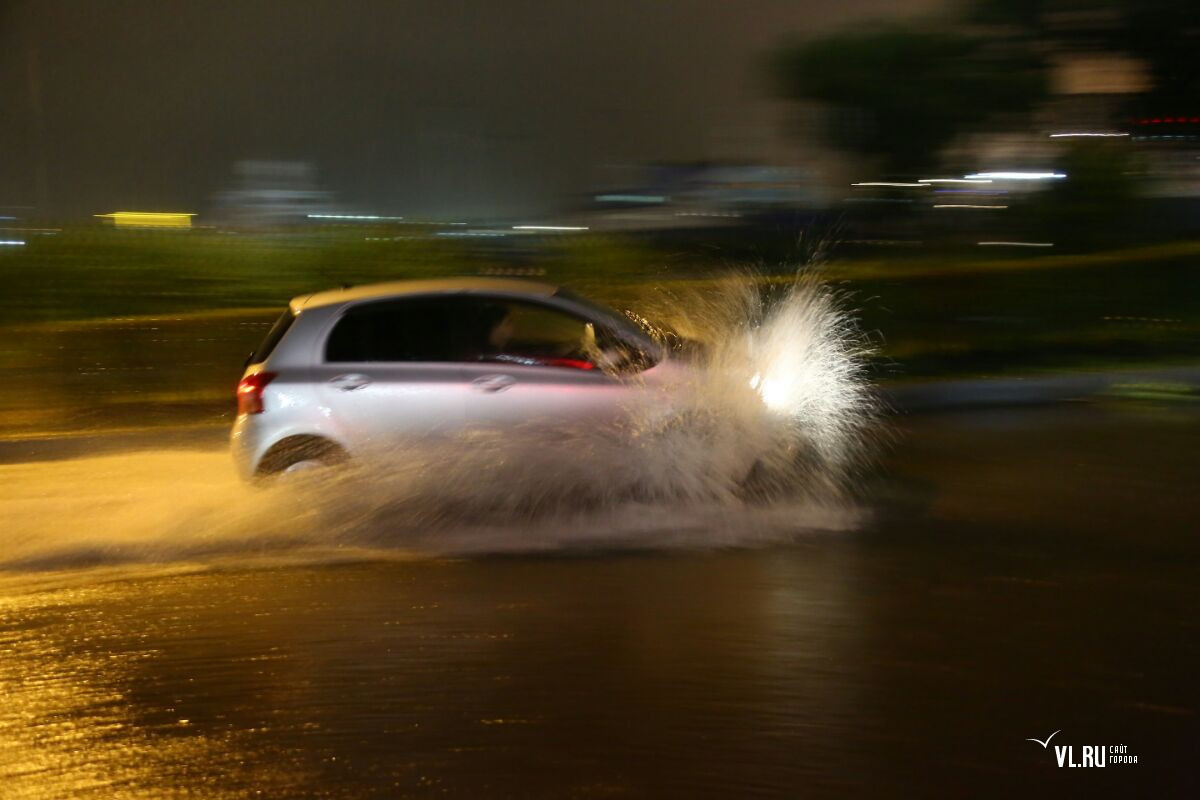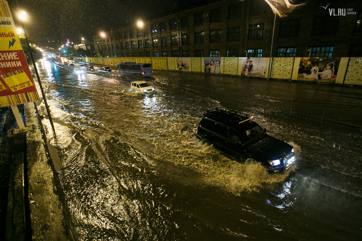 Обновление 27 августа, 03.30: Пока горожане прячутся от дождя по домам, особо смелые владивостокцы решили проверить - можно ли поймать волну в образовавшейся огромной луже на Калинина. Оказалось, что можно. Вейкбордисты прокатились по автомобильной дороге (подробнее...).