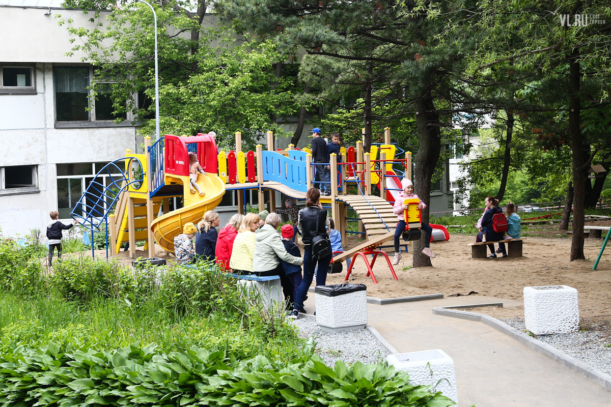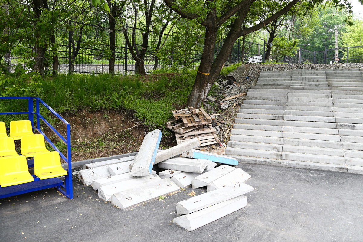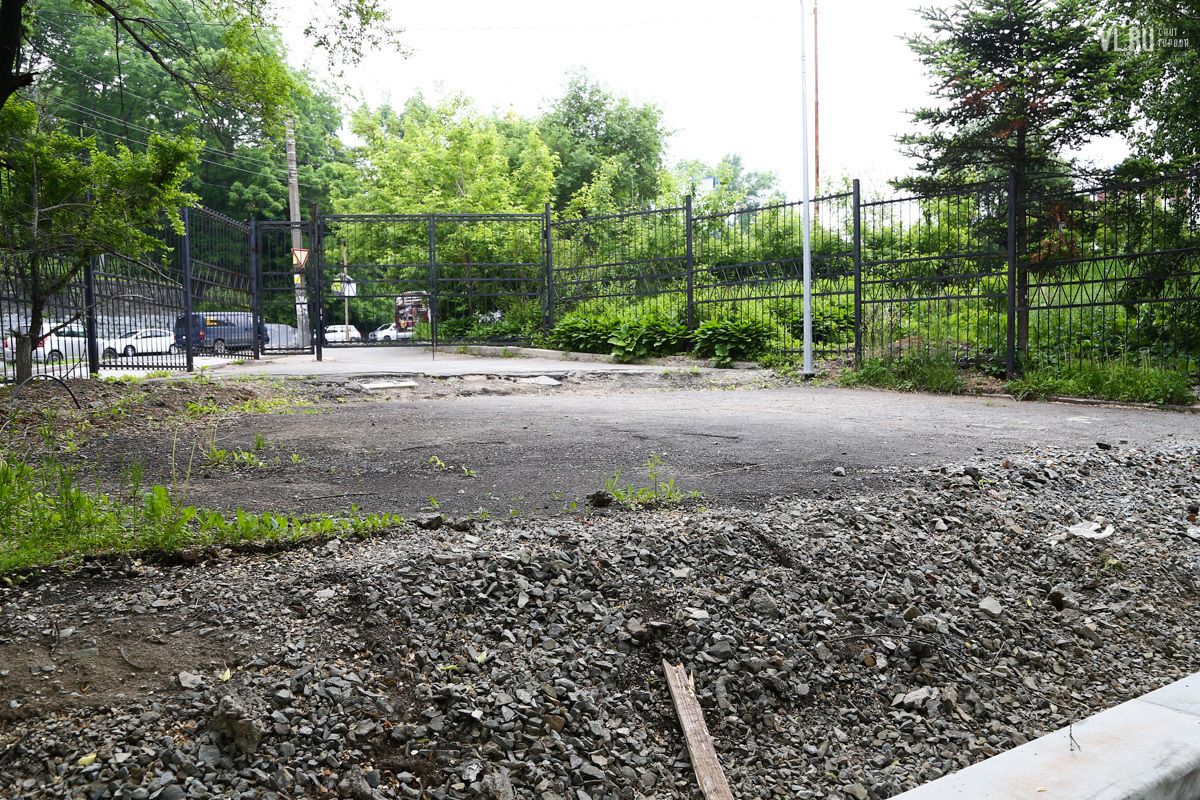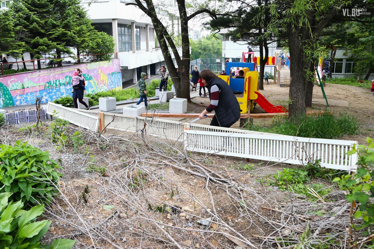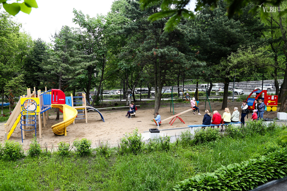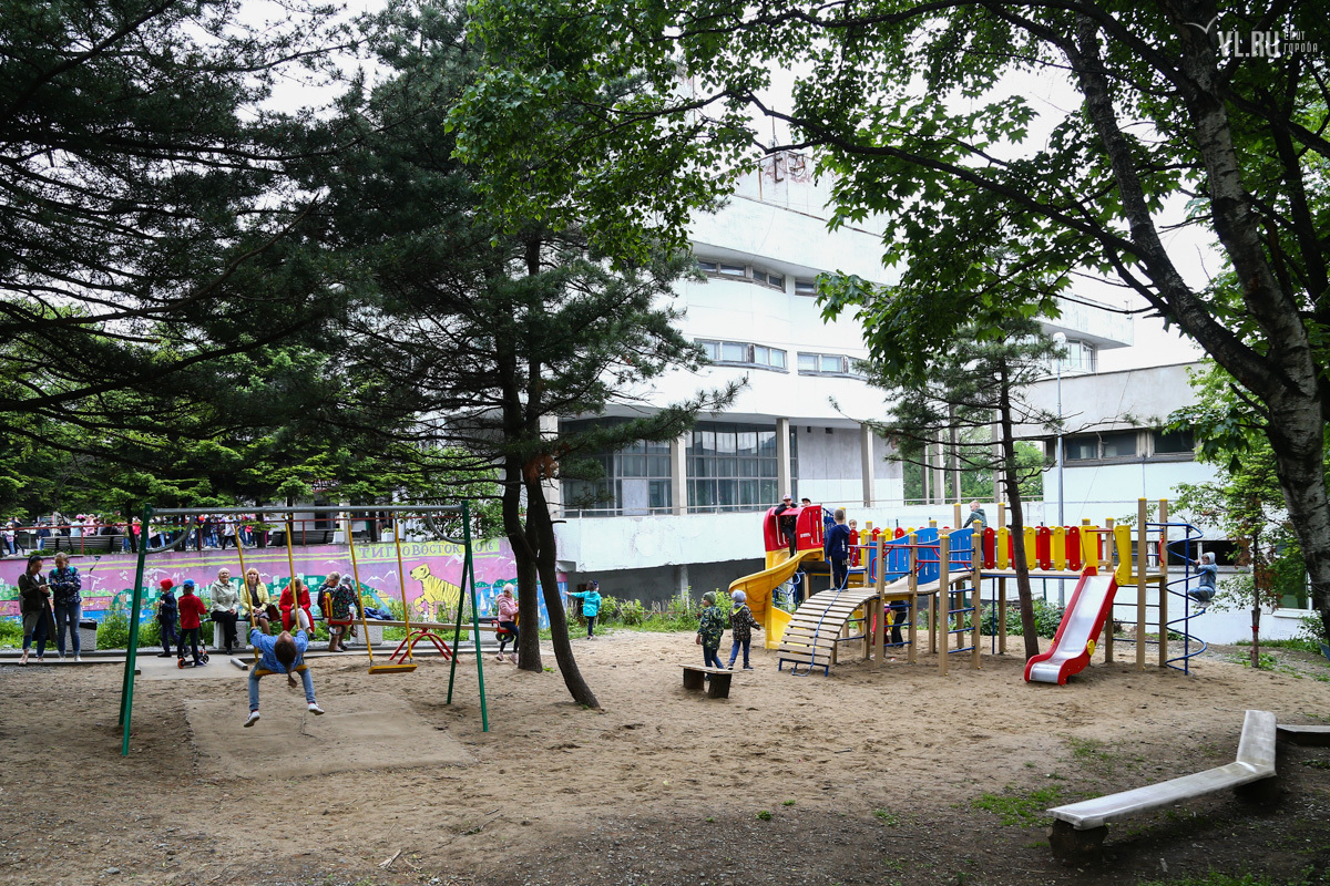 Кроме фонтана, работы в рамках федерального проекта «Городская комфортная среда» затронули детский парк Дворца. Прямо посреди рощи рабочие поставили типовой детский городок. Деревья – диморфанты, пихты черные, сосна корейская кедровая – получили повреждения и были частично забетонированы. Вместо сухостойных сосен спилили три здоровых амурских бархата.